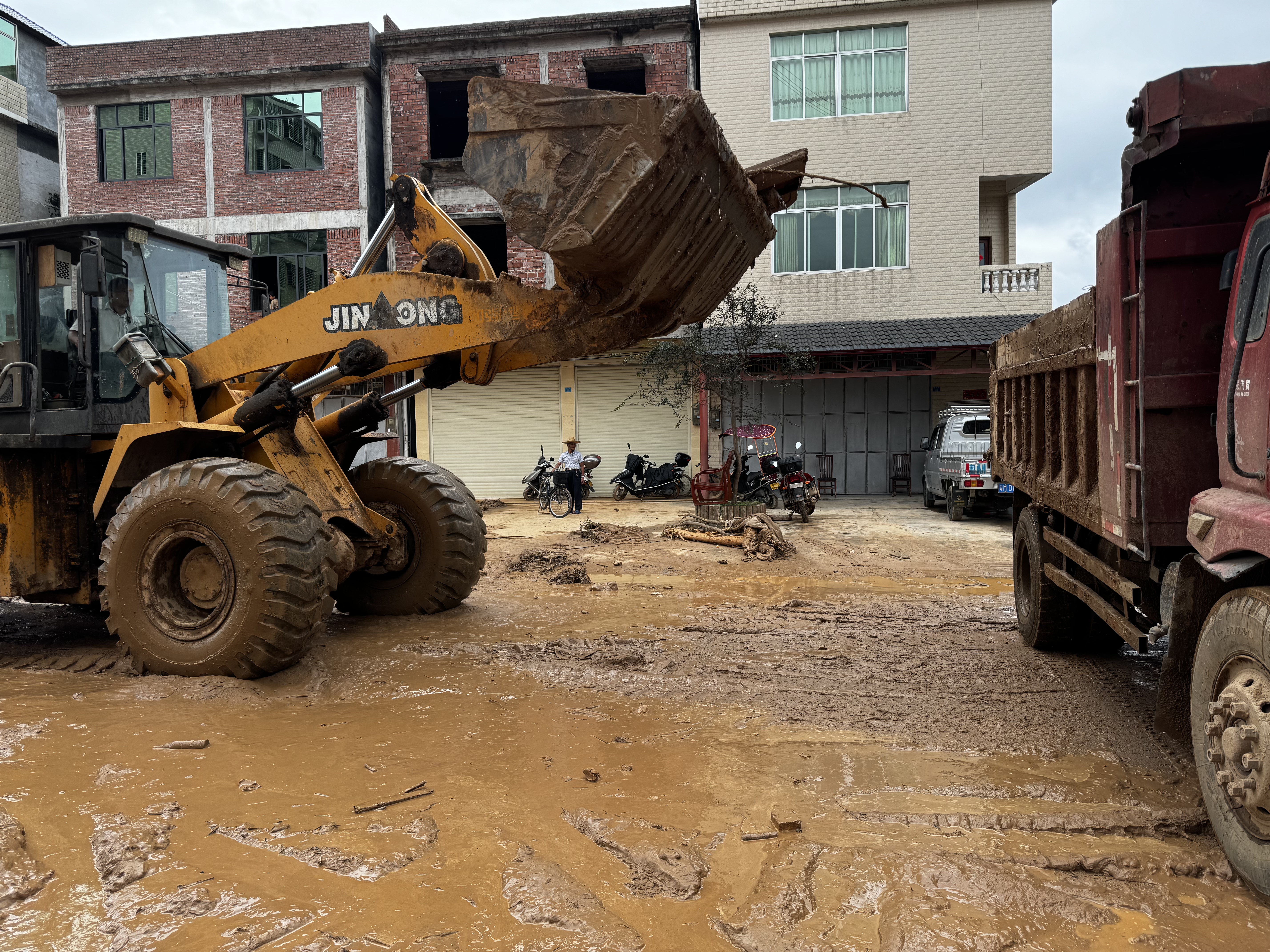 在梅州蕉岭县长潭镇白马村,一位村民驾驶铲车,把村里未转移的人平安带到安置点。