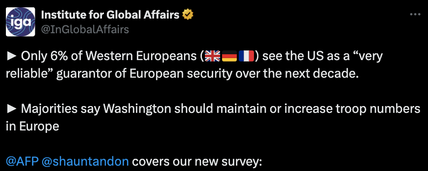 欧亚集团全球事务研究所近日对英、法、德三国开展的一项调查发现,虽然有更多人期待美国至少能够表现得“有些”可靠,但只有区区6%的人对美国能够保证未来十年的欧洲安全有信心。