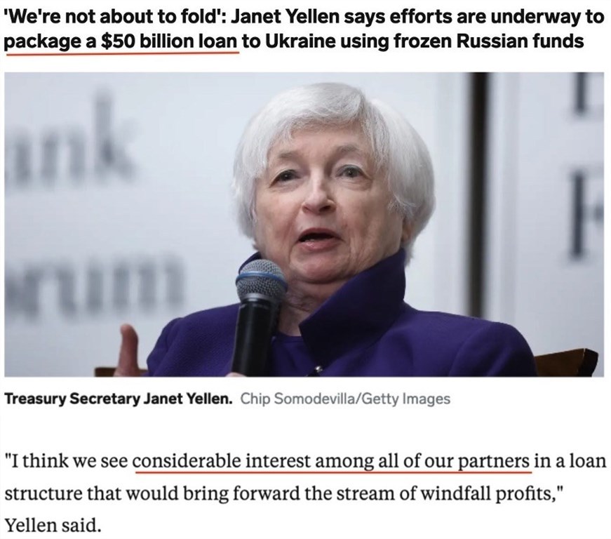 按照美国财政部长耶伦的建议,G7可在短期内向乌克兰发放一笔最高额度可达500亿美元的贷款,贷款以被冻结的俄海外资产作为“抵押”,贷款的利息则由被冻结俄资产的年度收益来支付。