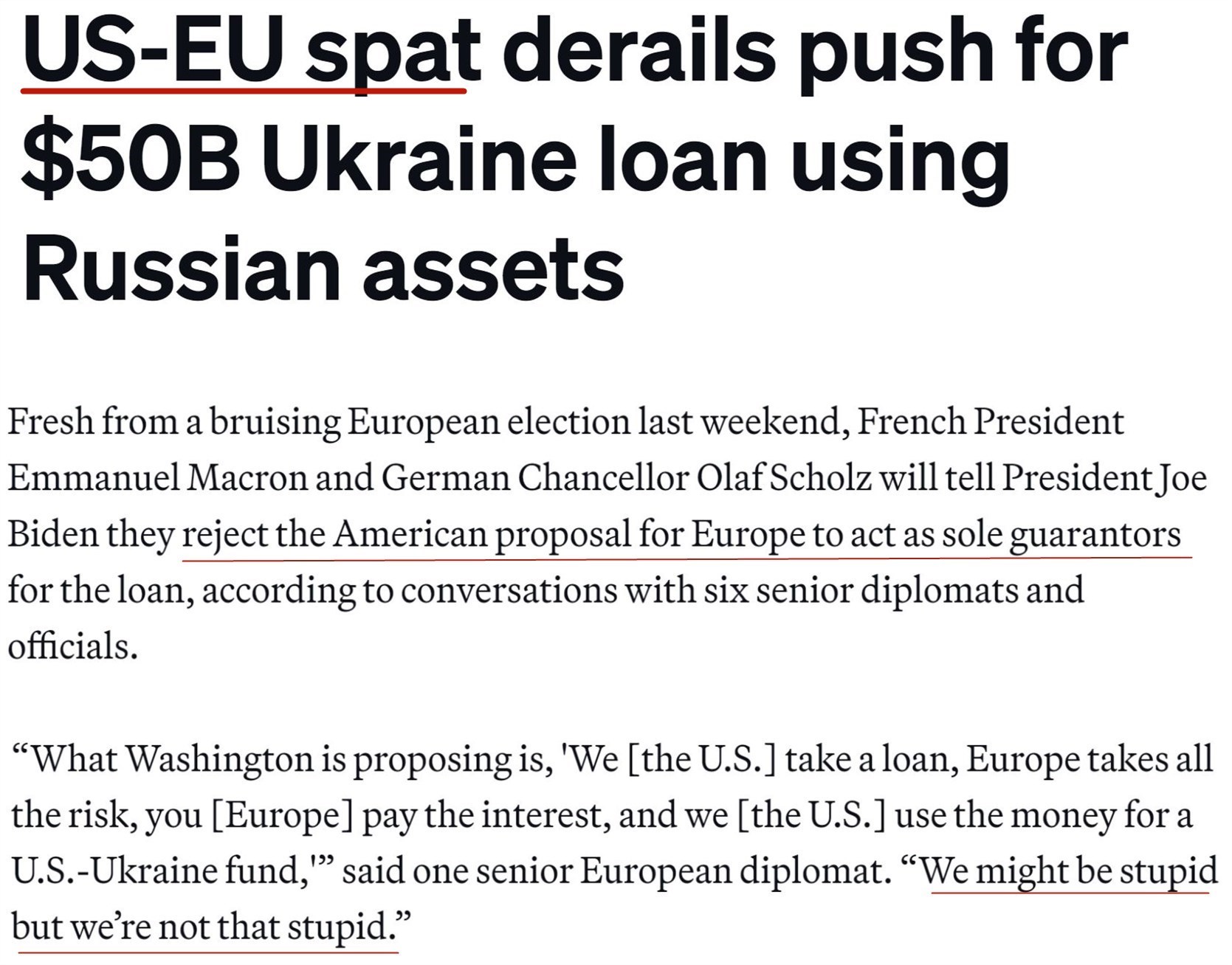 用一名欧盟外交官的话说:“华盛顿的计划是,由美国借款,同时由欧盟承担所有风险……我们可能是愚蠢的,但没有那么蠢。”