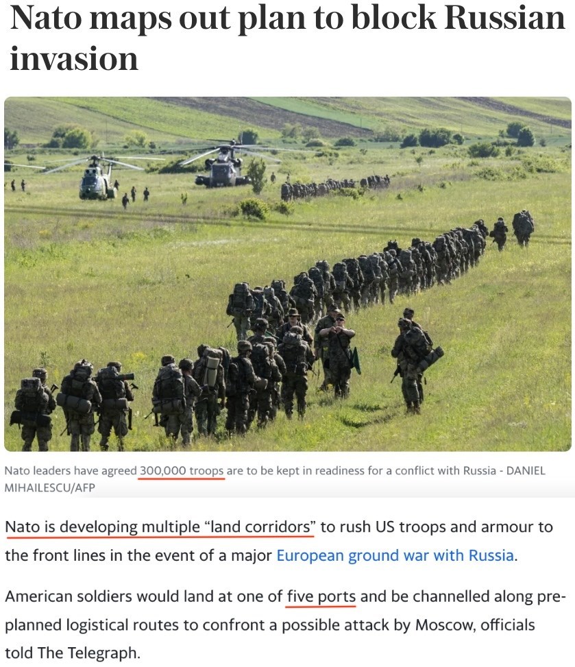 据英国《每日电讯报》近日报道,根据北约正在制订的计划,如果未来与俄罗斯开战,北约将沿着五条“陆地走廊”向欧洲“东部前线”紧急调派数以万计的驻欧美军。
