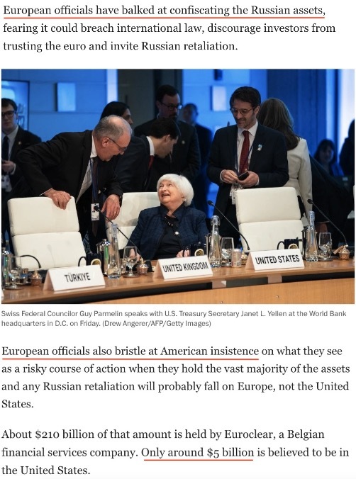 《华盛顿邮报》就此分析称,欧洲之所以一直对动用俄罗斯被冻结资产有所顾忌,不仅是因为担心这可能违反国际法,挫伤投资者对欧元的信心,引发全球资本逃离欧洲大陆,还有更多考虑。