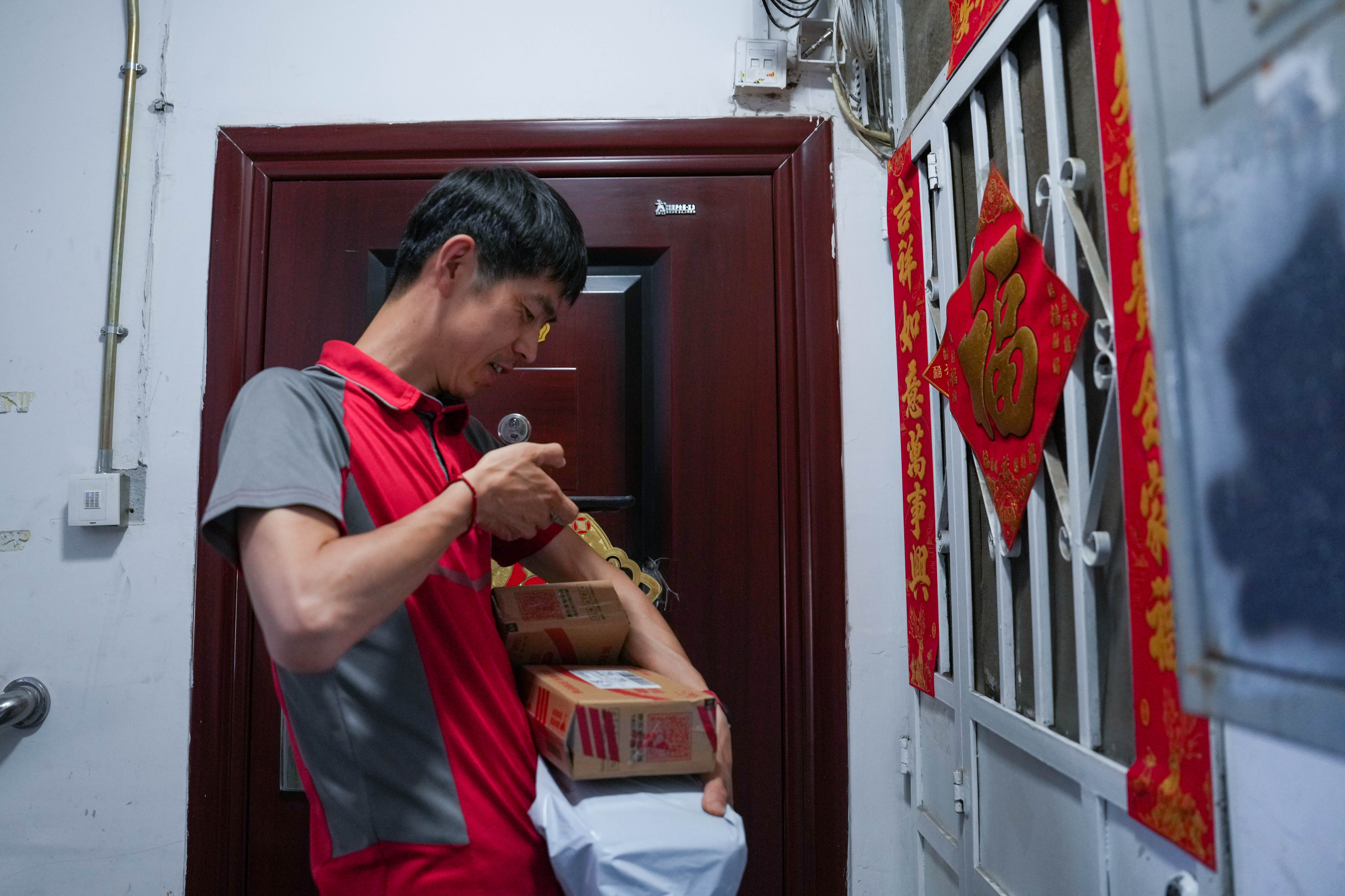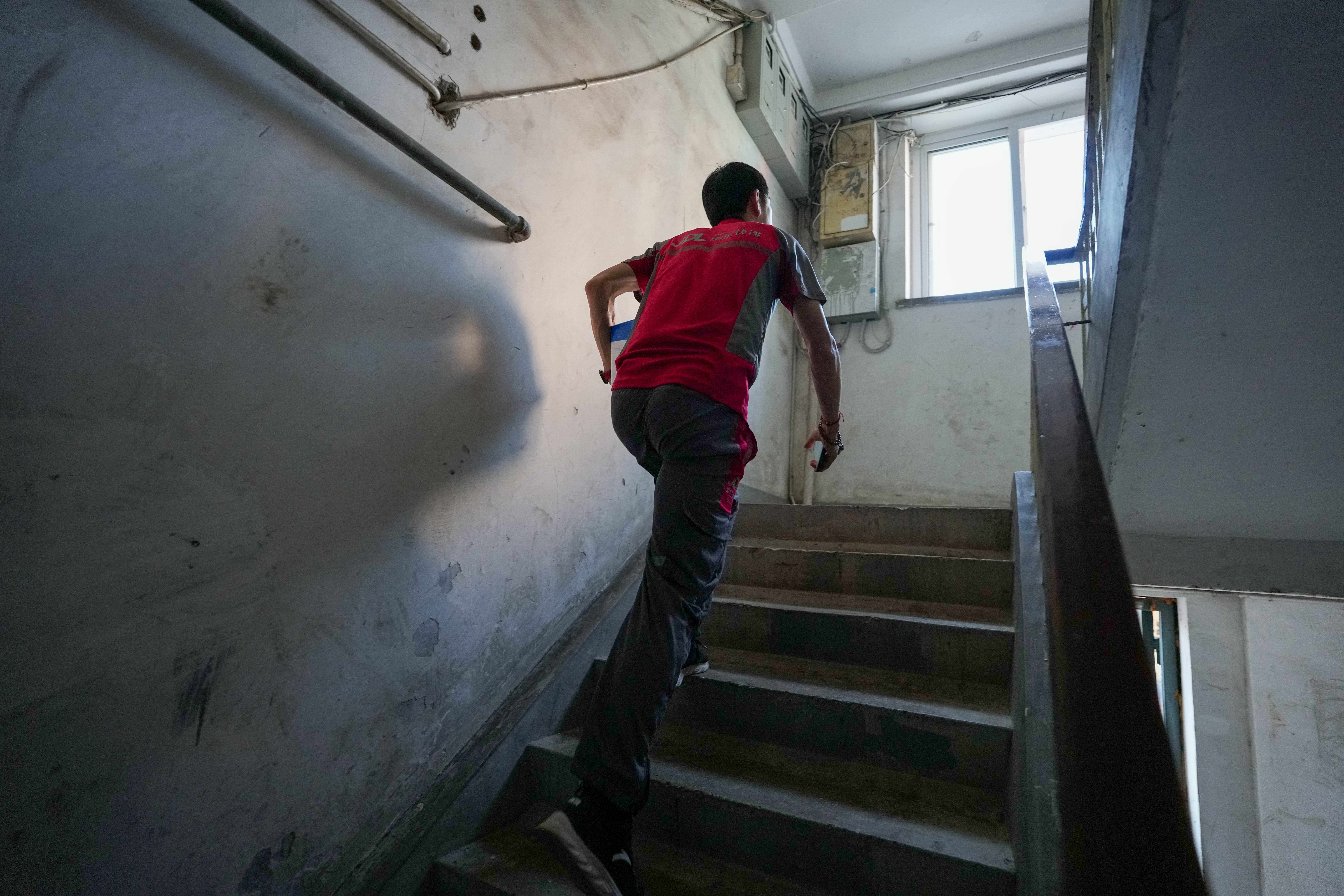 6月24日,栾玉帅在北京市海淀区一小区跑步上楼派送快递。