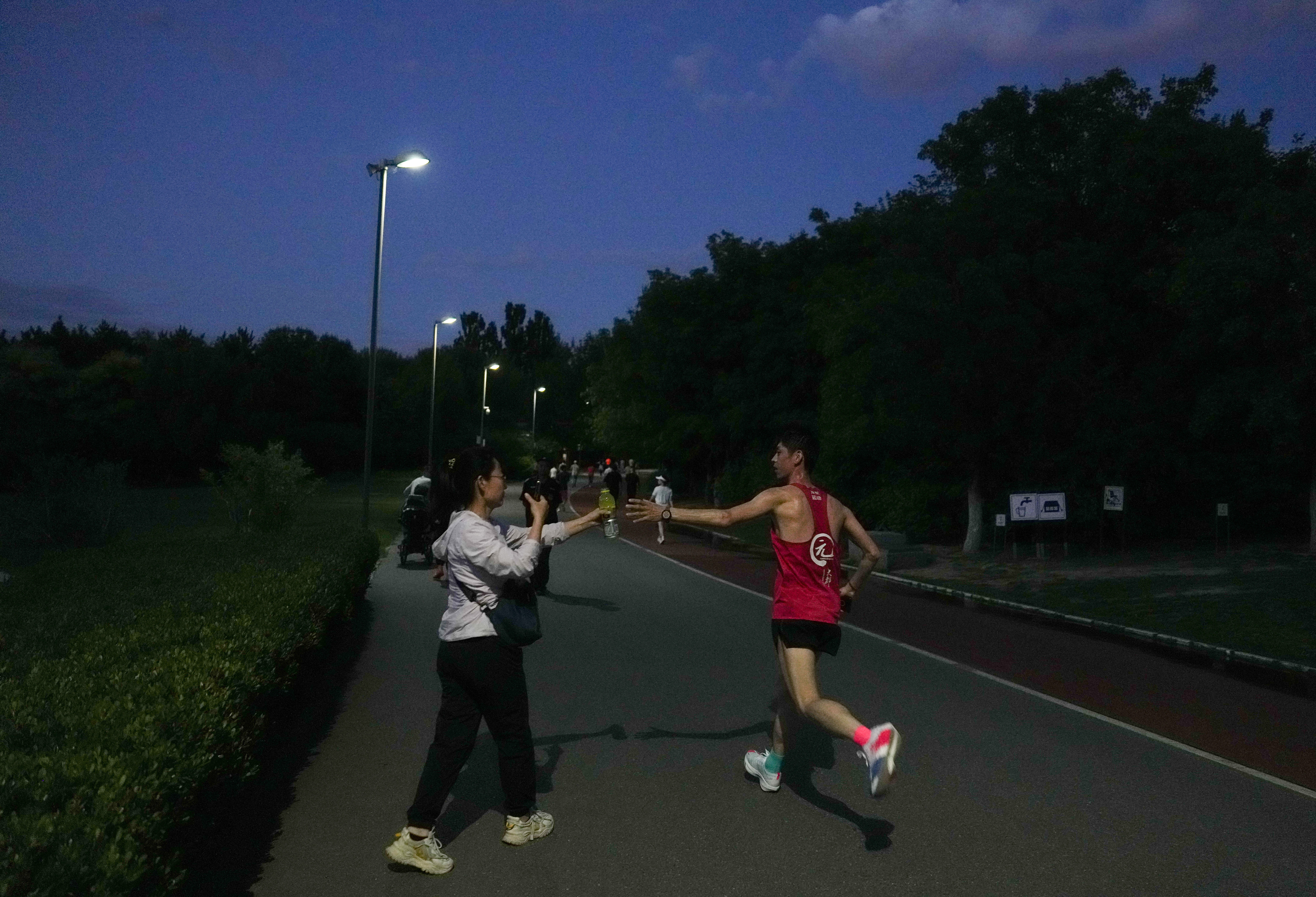 6月24日,在北京奥林匹克森林公园,栾玉帅(右)在跑步训练中从妻子手中接过运动饮料。
