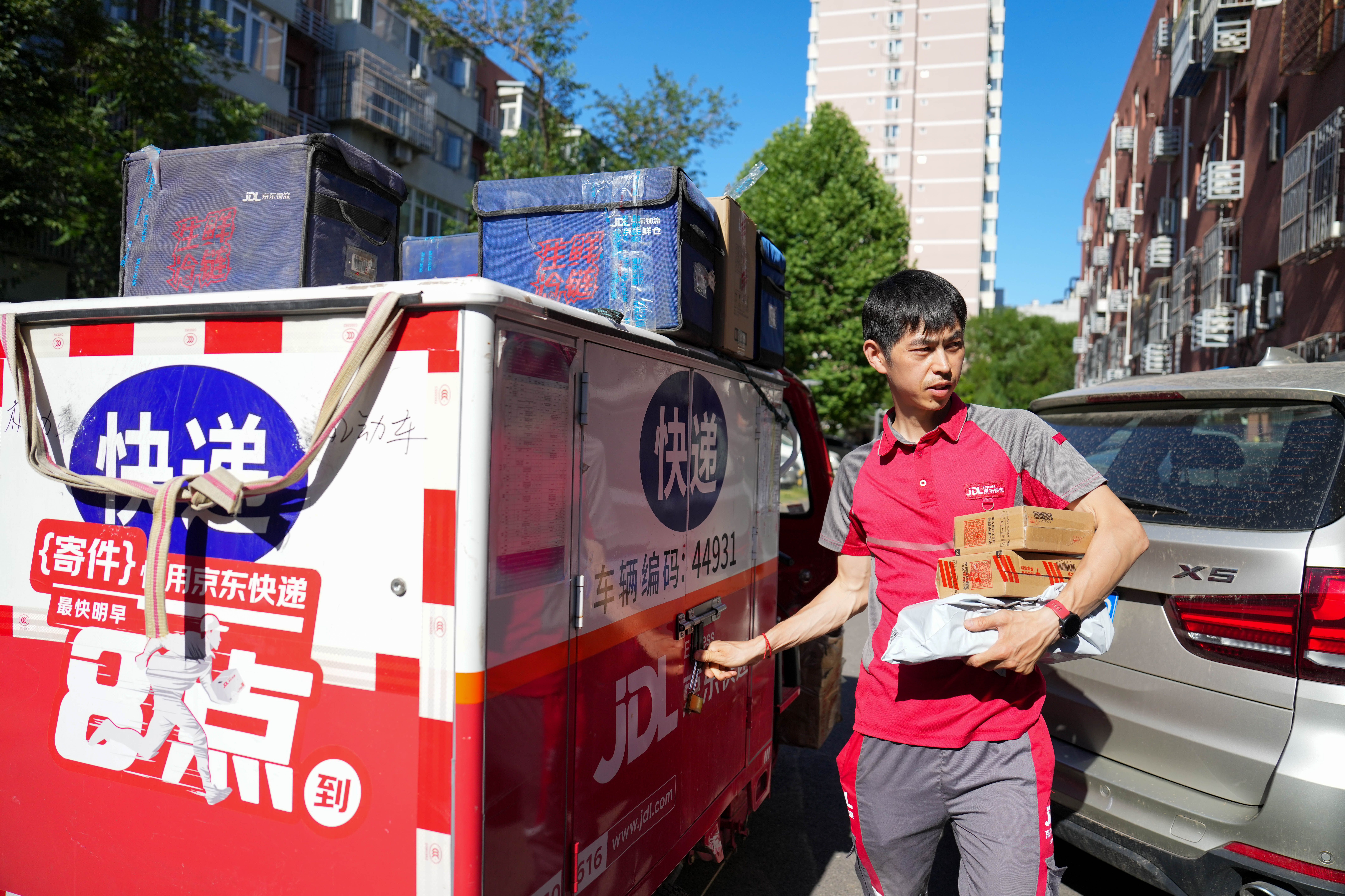6月24日,栾玉帅在北京市海淀区一小区派送快递。