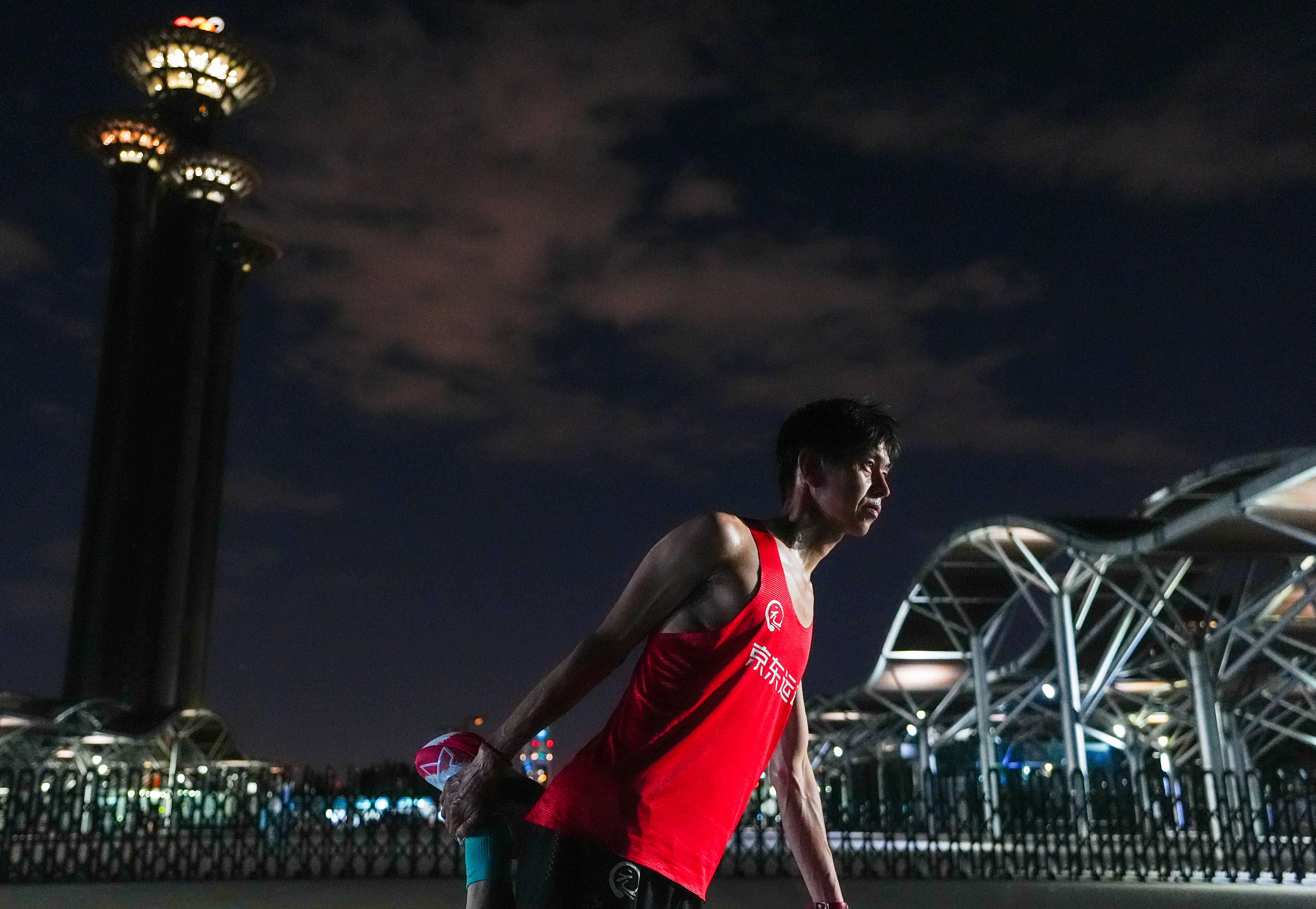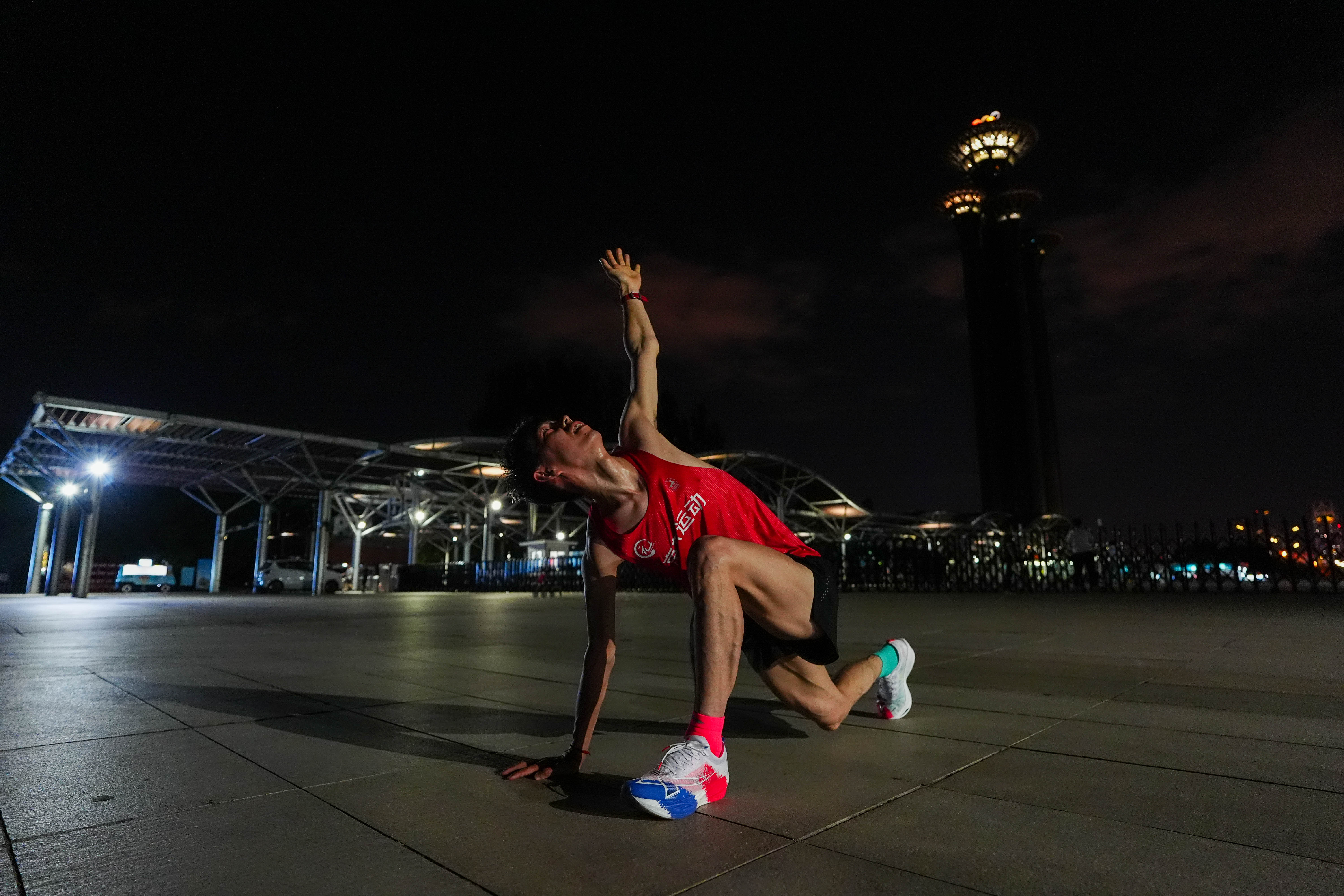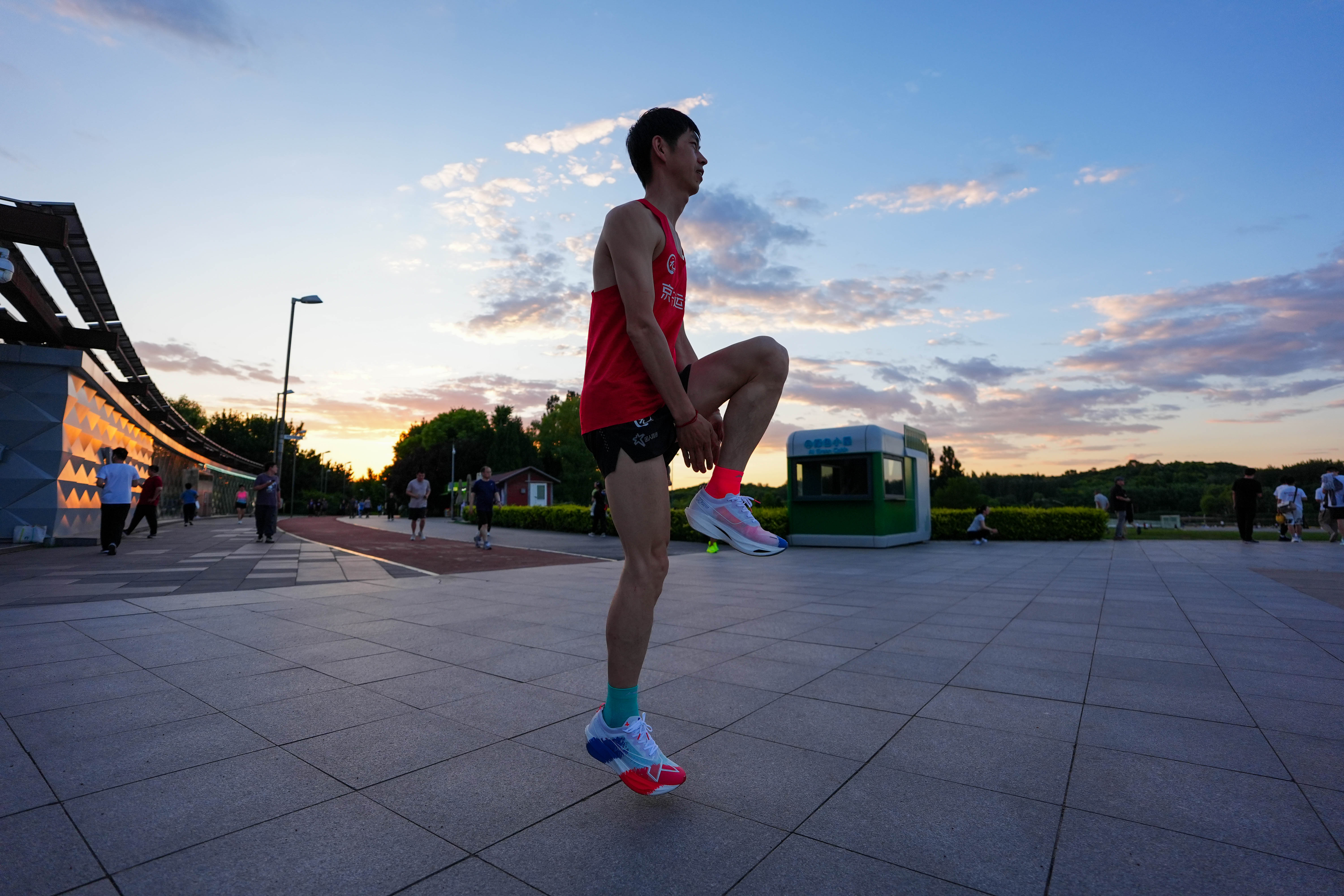 ↑6月24日,栾玉帅在北京奥林匹克森林公园进行跑后拉伸。