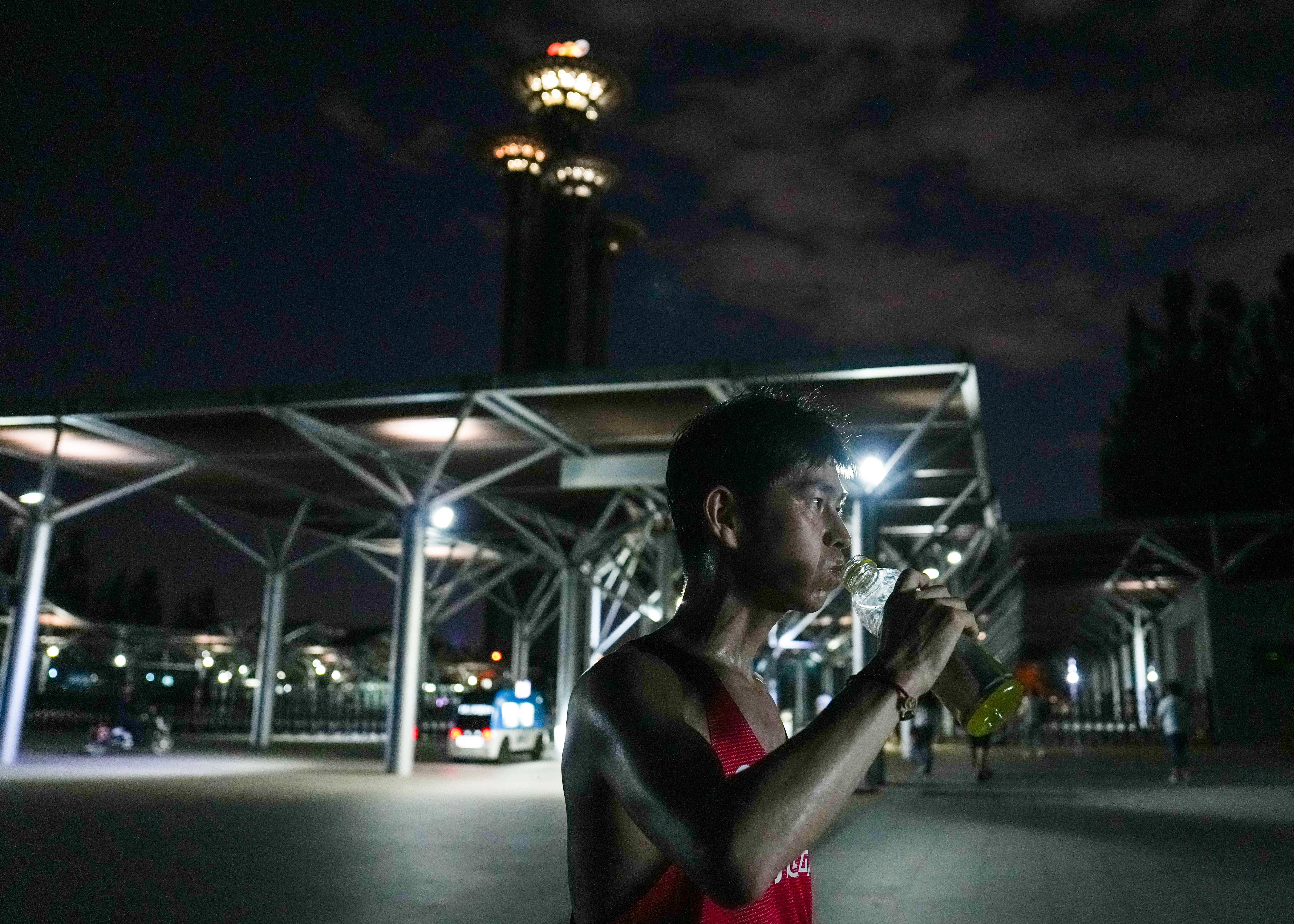 6月24日,在北京奥林匹克森林公园,栾玉帅在跑步训练后补水。