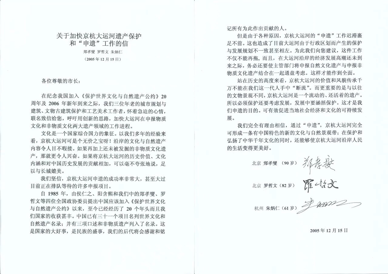 “在2006年新年到来之际,我们三位年老的城市规划与建筑、文物古建筑保护和工艺美术工作者,怀着急迫的心情,联手致信给您,呼吁用创新的思路,加快大运河在申报物质文化和非物质文化两大遗产领域的工作进程……”2005年12月15日,“运河三老”联合发出《关于加快京杭大运河遗产保护和“申遗”工作的信》,掀起了大运河申遗的热潮。