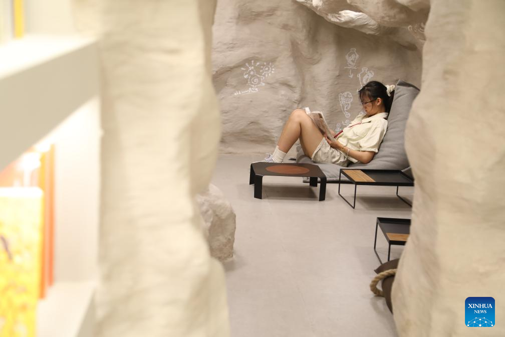 A young visitor reads at a bookstore of art and life gallery affiliated with the Gansu Provincial Museum in Lanzhou, northwest China's Gansu Province, June 13, 2024. (Xinhua/Ma Sha)