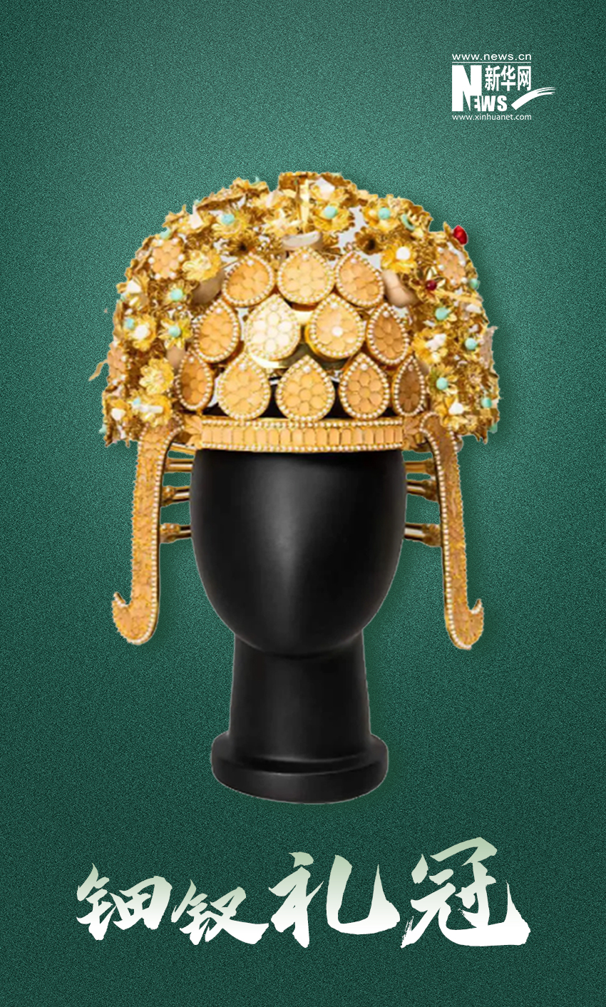 隋炀帝萧后冠复制,原物出土于扬州萧后墓,考古发掘和研究证明,一号墓是隋炀帝墓,二号墓为隋炀帝萧后墓。考古人员在隋炀帝墓和萧后墓里一共清理出珍贵文物400余件套,该冠采用了金、铜、铁、玻璃、汉白玉、珍珠、木、漆、棉、丝等10种材料,饰件加工时经过了锤揲、焊接、掐丝、镶嵌等12类工艺,冠上立12株花树,正面饰钿花12枚。冠前下端置宝钿蔽髻,冠体两侧各置博鬓一件与冠配套另有宝钿饰首的12枚钗,该冠的部件配置完全符合《隋书》中对皇后等级细钗冠的描述,这一发现为当年“中国大运河”申遗成功增添又一重要佐证。