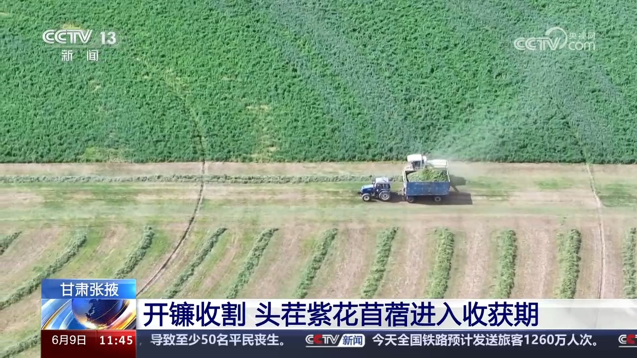 跟随镜头,我们来到甘肃张掖民乐县。眼下,当地8000亩优质紫花苜蓿进入了收获期,收割机来回穿梭,一派丰收景象。作为优质饲料,苜蓿对收割节点要求苛刻,刚打花苞的苜蓿营养价值最高,开花后营养价值则会大打折扣。为此,当地发挥大型机械优势,购置先进的苜蓿刈割机械和搂草机械,并通过青贮打包机械进行整体打包,有效延长存贮时间,更加便于保鲜和露天贮存。据介绍,这片紫花苜蓿的总产量预计达6400吨。