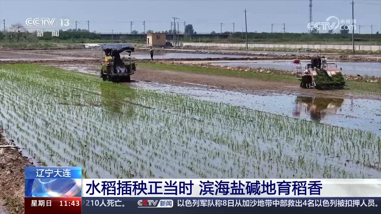 现在画面中看到的是辽宁大连普兰店区大卢社区的千亩优质水稻示范田。这里地处黄海之滨,海水渗透让土质盐碱化,多年来农户们通过种植耐盐碱的水稻品种,让这里稻香四溢。此时,农机手正驾驶满载秧苗的插秧机,在水田中往返穿梭,一株株青翠秧苗有序移栽进田。据了解,这些秧苗是采用创新改良的“地膜打孔”技术育苗的,节约了成本和人力。今年大连水稻计划插秧面积达26.8万亩,预计在6月中上旬基本结束。