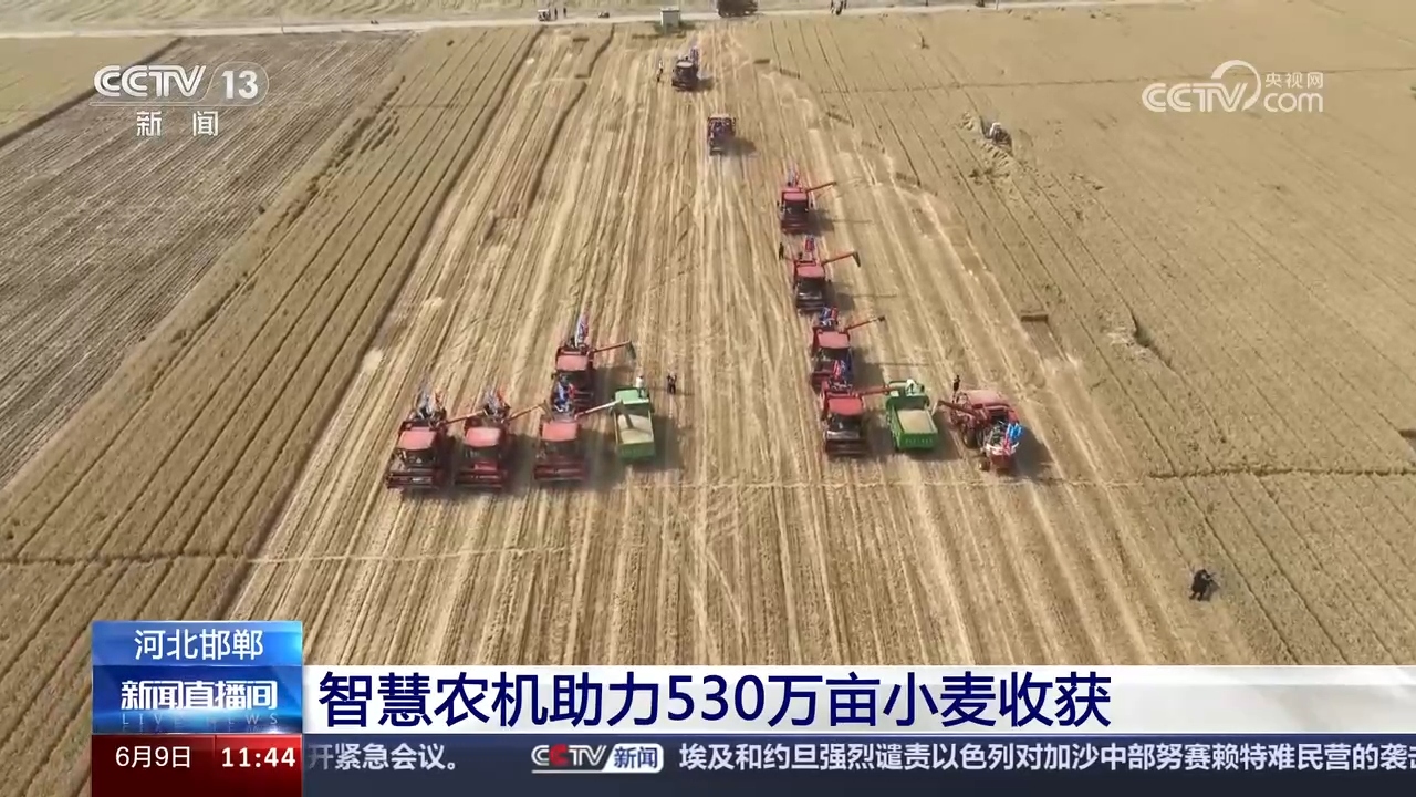 眼下,在河北邯郸临漳县,小麦联合收割机正在麦田里来回穿梭。今年邯郸市组织使用了装有北斗导航的新型智慧农机,不仅可以实现自动行走直线、割台随着地形起伏自动调整,减少漏撒麦粒损失,还可以随机进行测产。据了解,在新型智慧农机的助力下,邯郸市530多万亩小麦将在6月12日前后完成收割任务,6月20日前完成夏玉米播种任务,为秋粮的丰收打下良好基础。