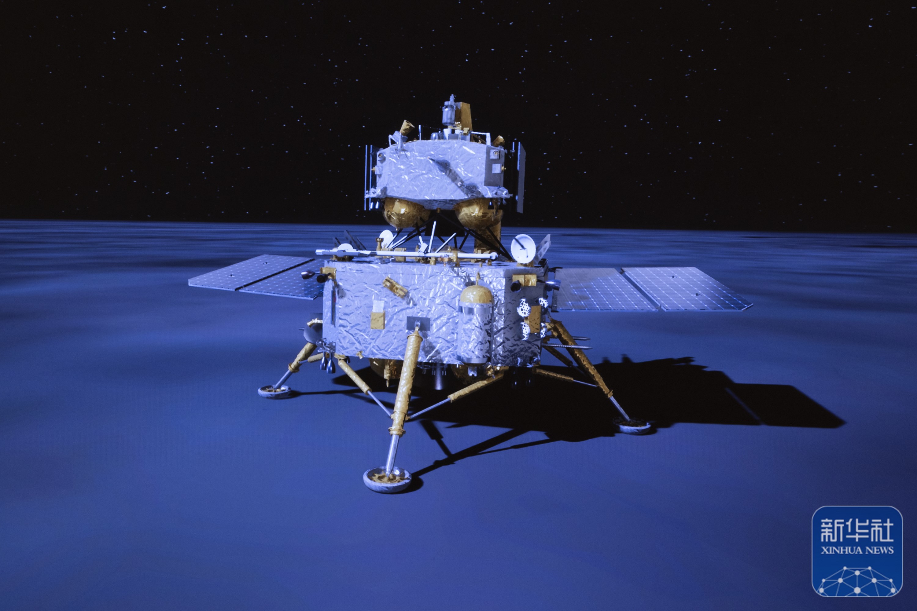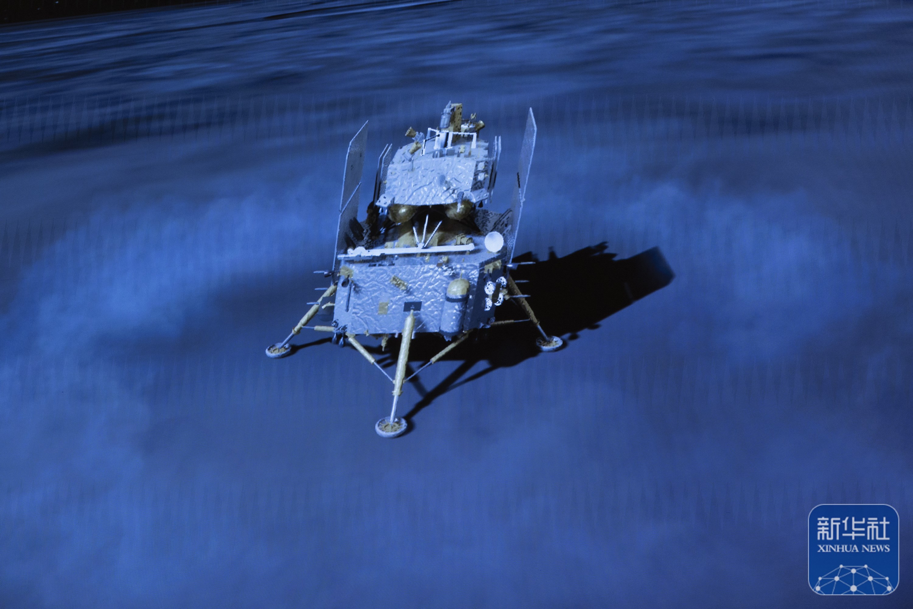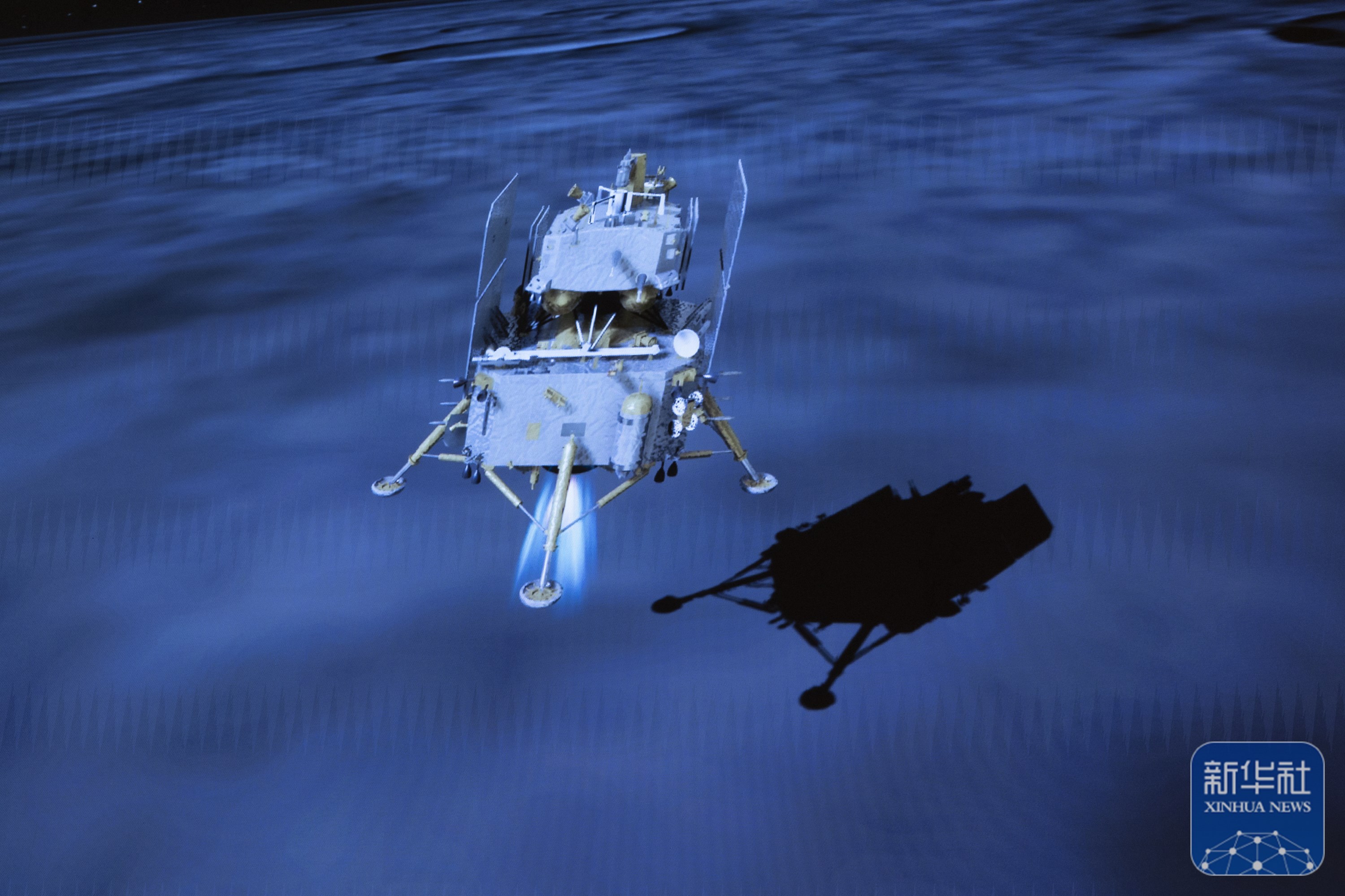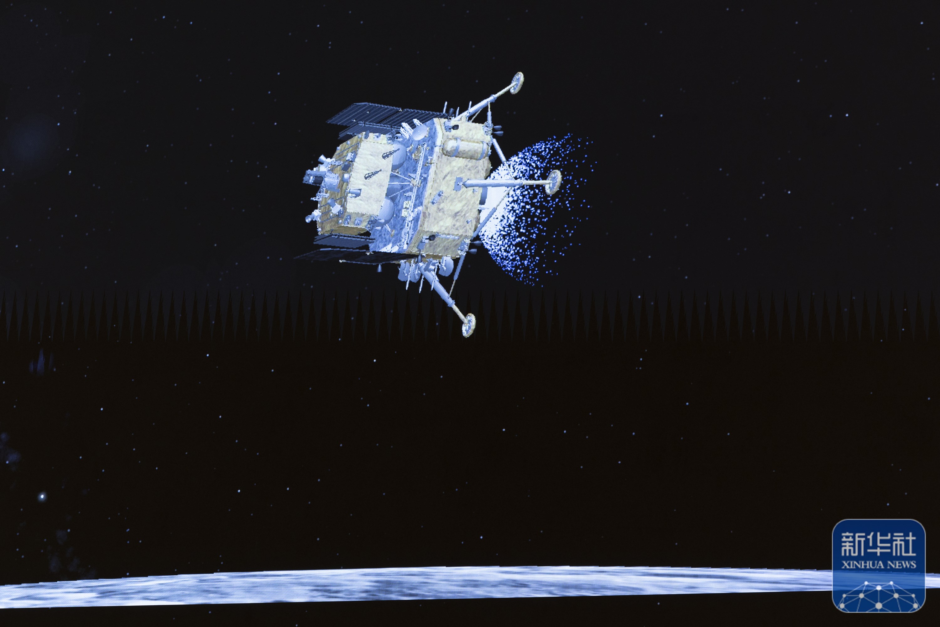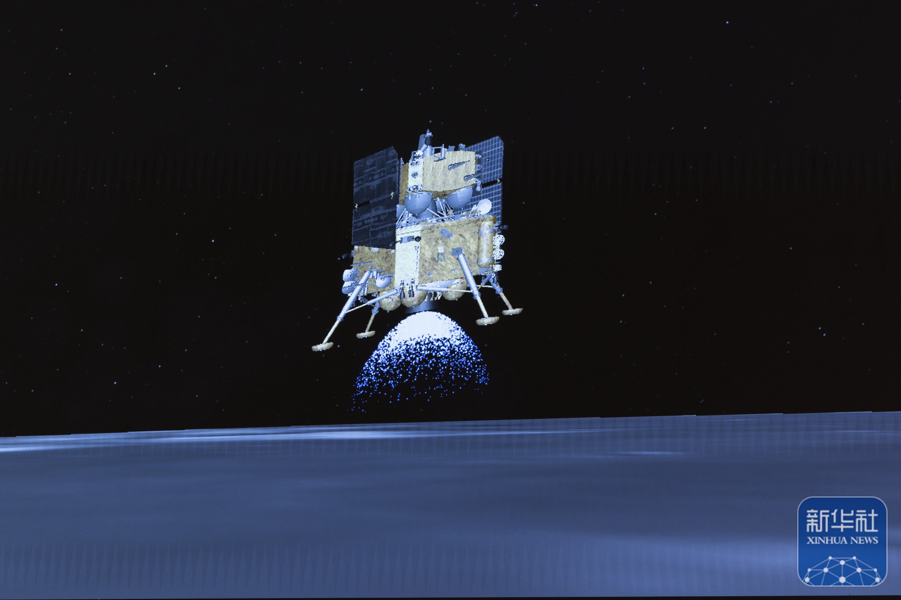 这是6月2日在北京航天飞行控制中心屏幕上拍摄的嫦娥六号着陆器和上升器组合体着陆月背的模拟动画画面。