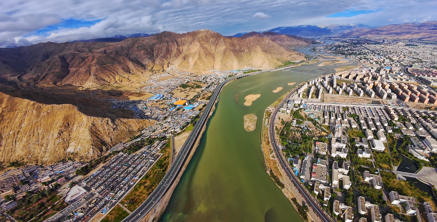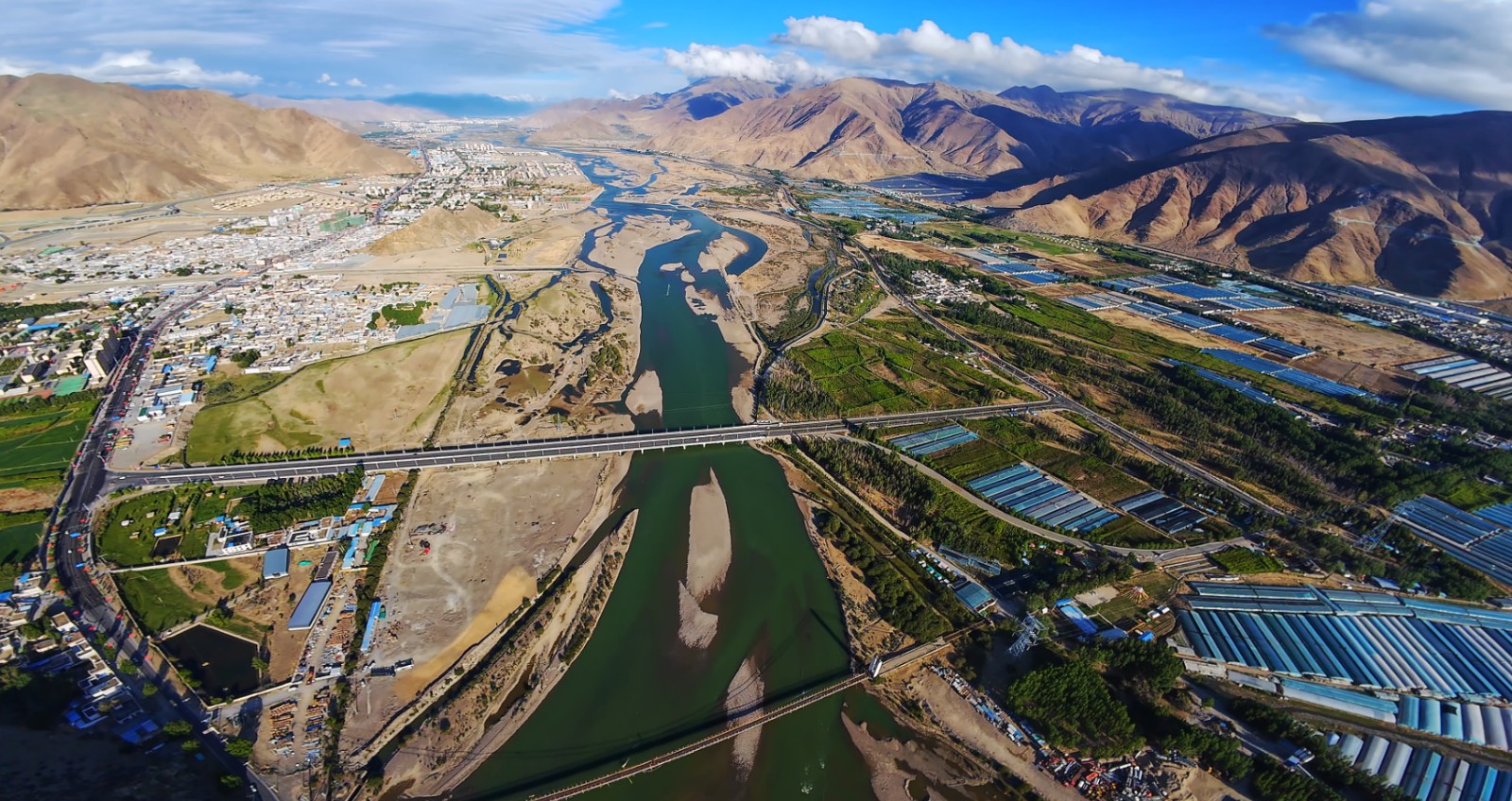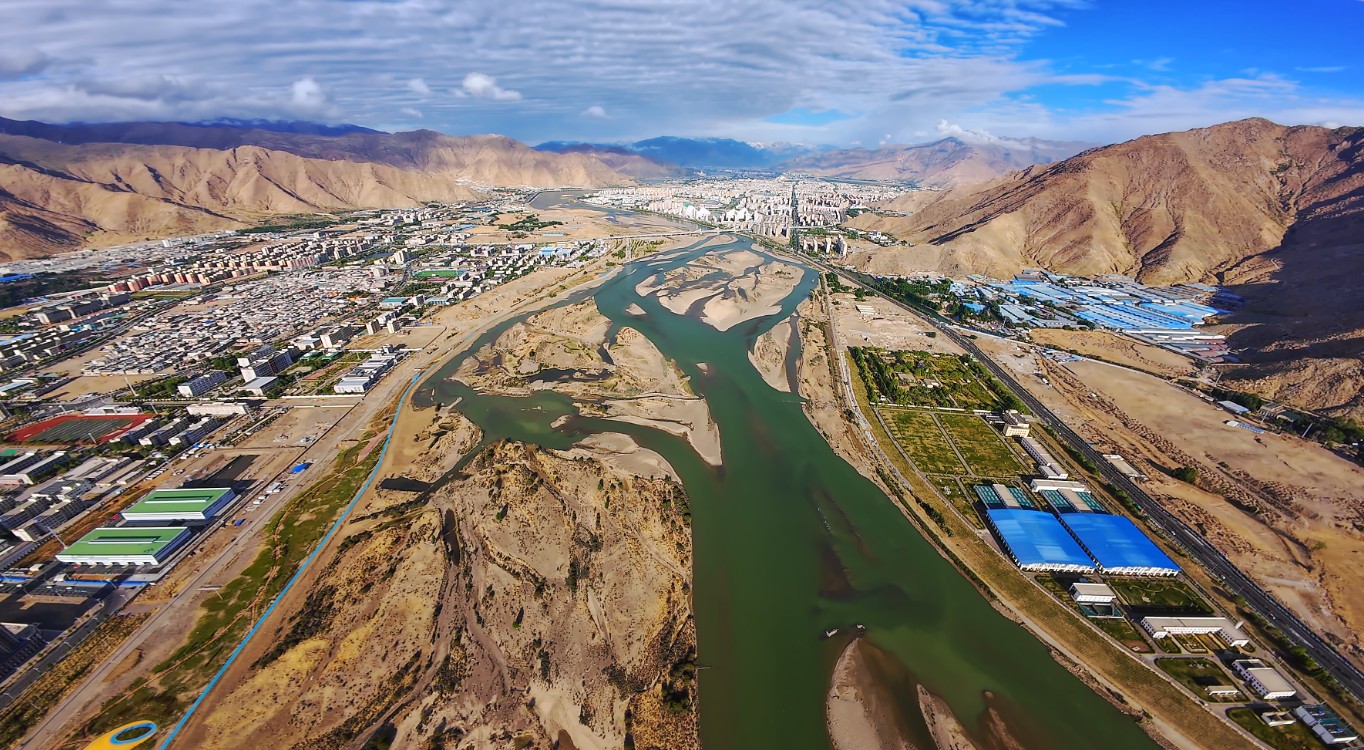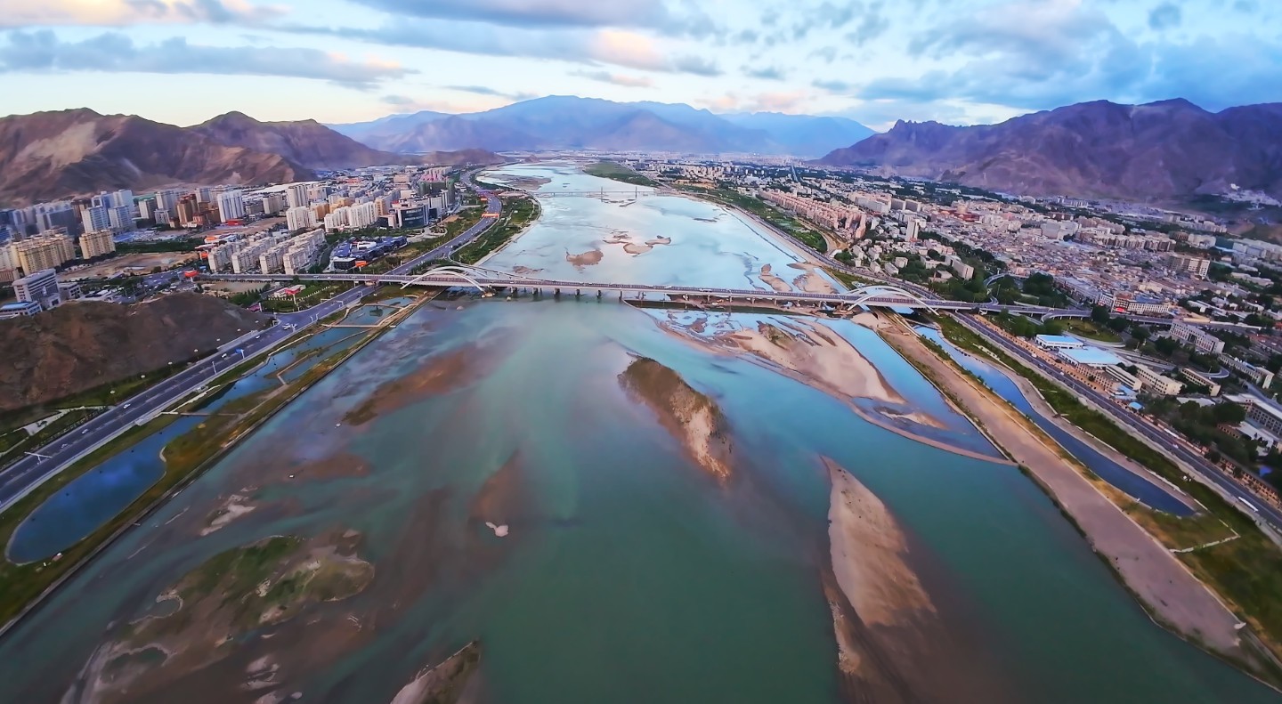 近年来,拉萨市大力进行拉萨河水系生态治理。从拉萨城区柳梧大桥沿拉萨河溯流而上,从空中俯瞰,如今的拉萨河两岸,绿地连绵,河水湛蓝,与金色沙洲互相映衬。拉萨河谷地带娴静安好,好似大自然在群山之间画就的一幅浓墨重彩的画卷。