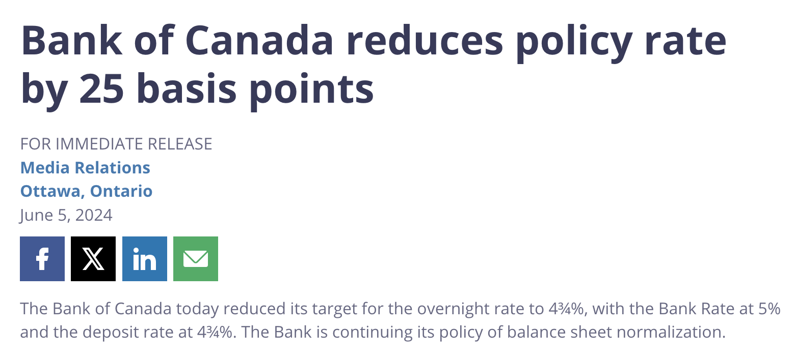当地时间6月5日,加拿大央行在官网发布利率决议,宣布将隔夜利率目标从5%下调至4.75%,成为七国集团中首个在本轮抗通胀后放松货币政策的央行。