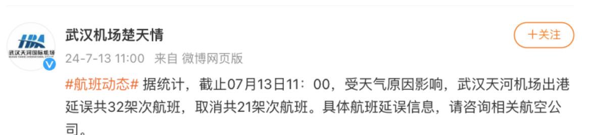 截至7月13日11时,受天气原因影响,武汉天河机场出港延误共32架次航班,取消共21架次航班。