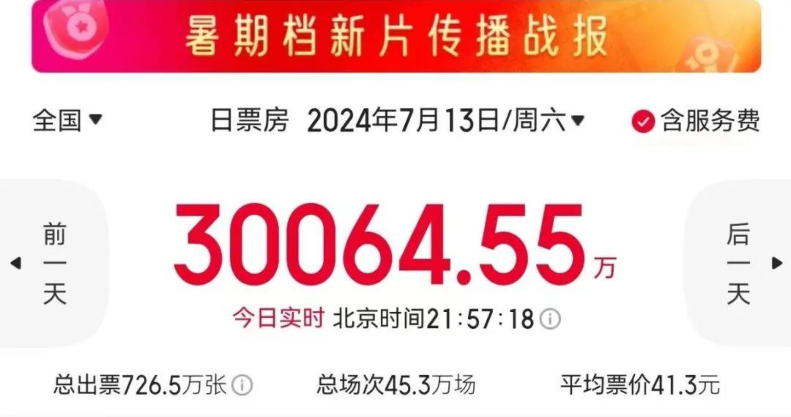 据票务平台数据,截至7月13日21时50分,暑期档大盘单日票房首破3亿元,继2024年5月3日后时隔70天,大盘单日票房再度突破3亿元。
