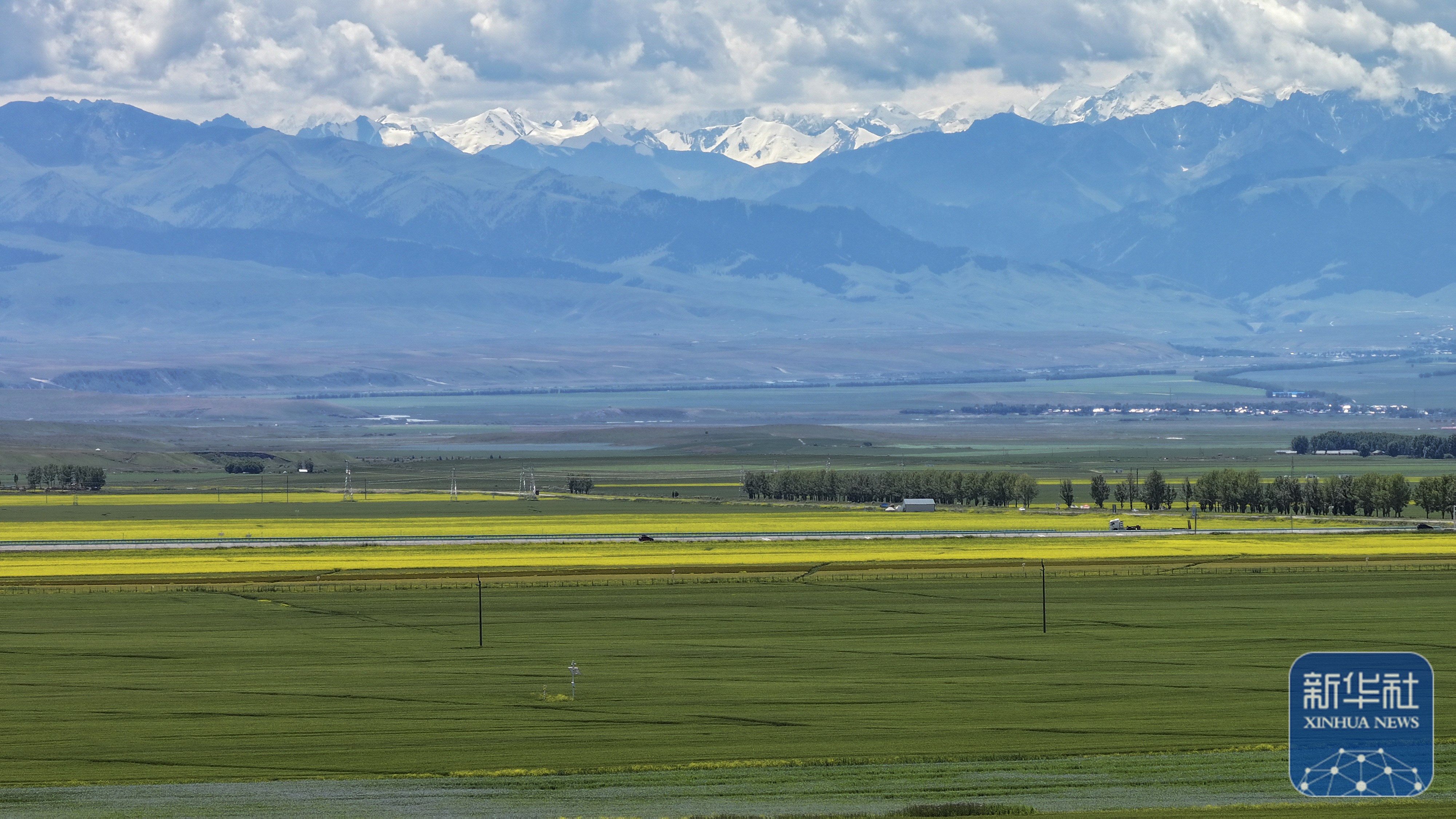 这是7月12日在新疆昭苏拍摄的草原和雪山(无人机照片)。