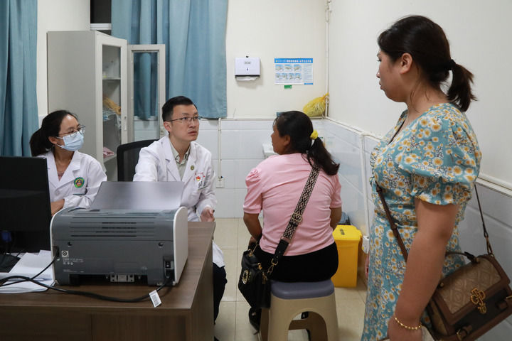 上海第九人民医院援滇医疗队队长刘菲(左二)在云南省普洱市澜沧县第一人民医院诊室内接诊(2024年7月3日摄)。新华社发(潘华杰 摄)