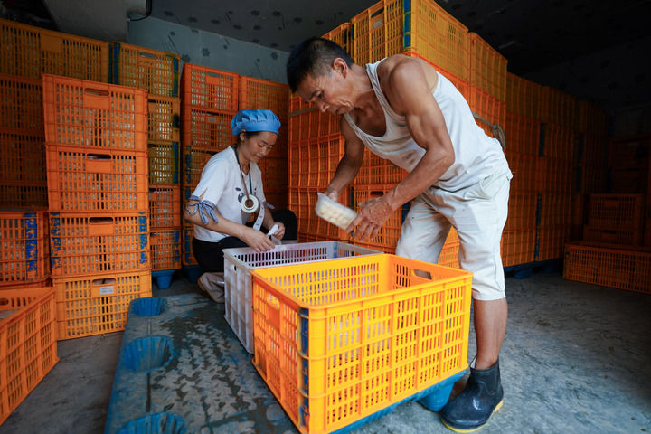 在云南省文山壮族苗族自治州西畴县蚌谷乡龙正村,两名工人在刘禹丹的豆腐加工厂工作(2023年7月27日摄)。新华社记者 陈欣波 摄