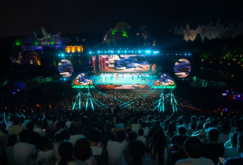 随着夜色渐深,长影世纪城原创戏剧《山海奇情》正式开演,观演区人山人海、座无虚席,炫彩的灯光搭配舞台设计,再加上演员的精彩演绎,游客们沉浸在精彩的剧情里,走进了《山海经》的世界中。