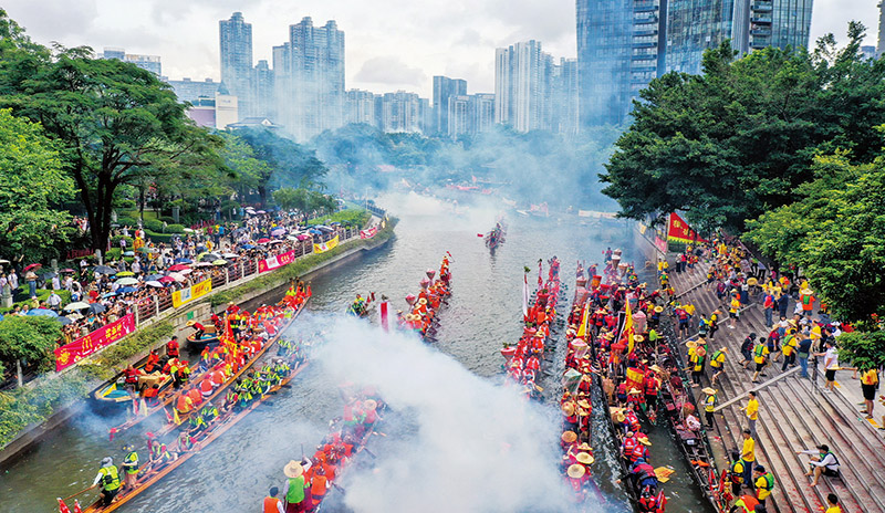 中国式现代化是物质文明和精神文明相协调的现代化。猎德村是位于广东广州珠江新城一座历史悠久的古村。每年端午期间,猎德村民都会遵照岭南龙舟文化习俗,在祠堂和河涌,用各种充满仪式感的“龙船景”展示对端午文化的传承。图为2024年6月10日,十里八乡的龙舟汇聚在猎德涌参加“龙船景”。 新华社记者 刘大伟/摄