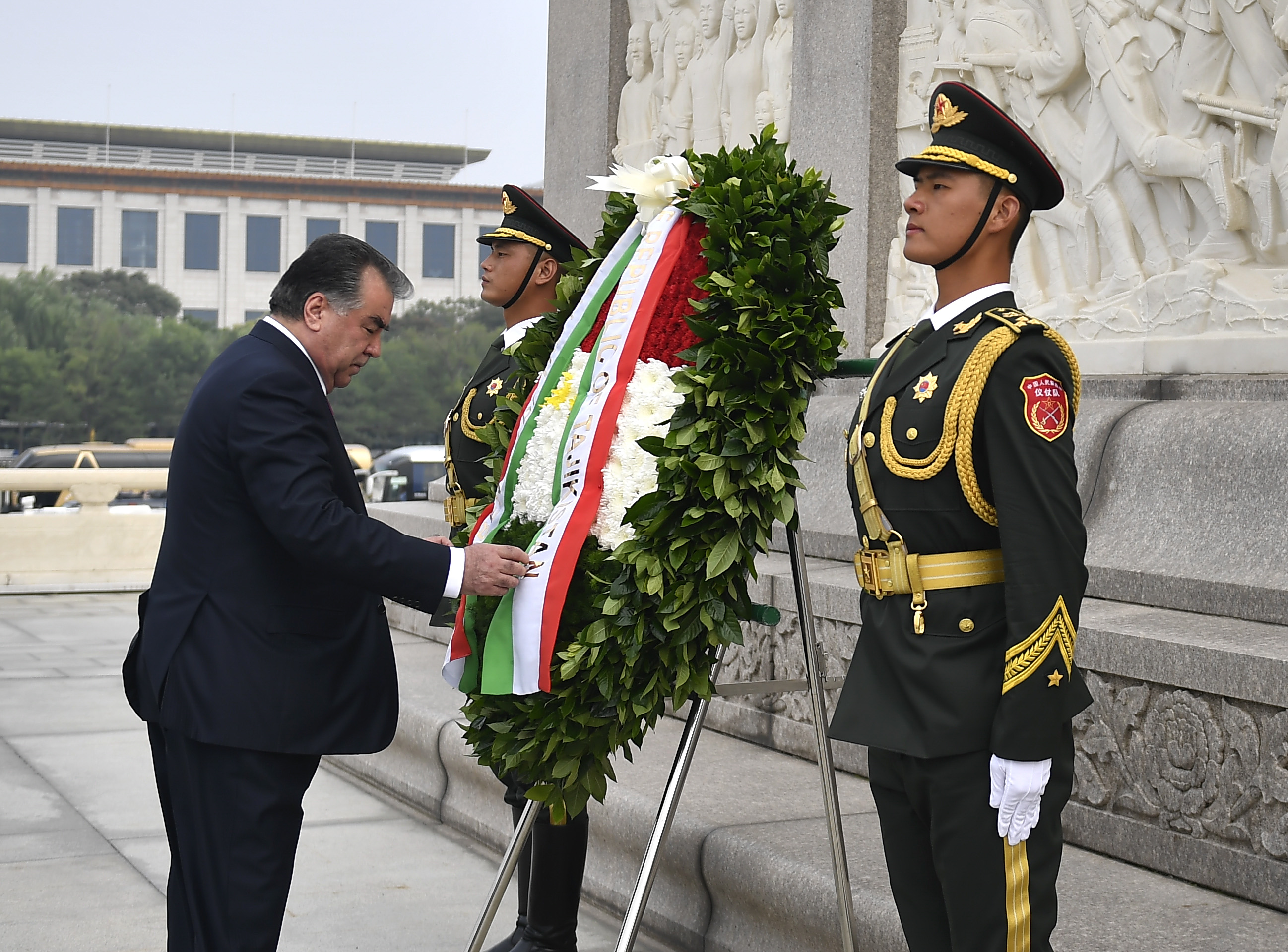 2017年8月31日,塔吉克斯坦总统拉赫蒙前往北京天安门广场,向人民英雄纪念碑敬献花圈。