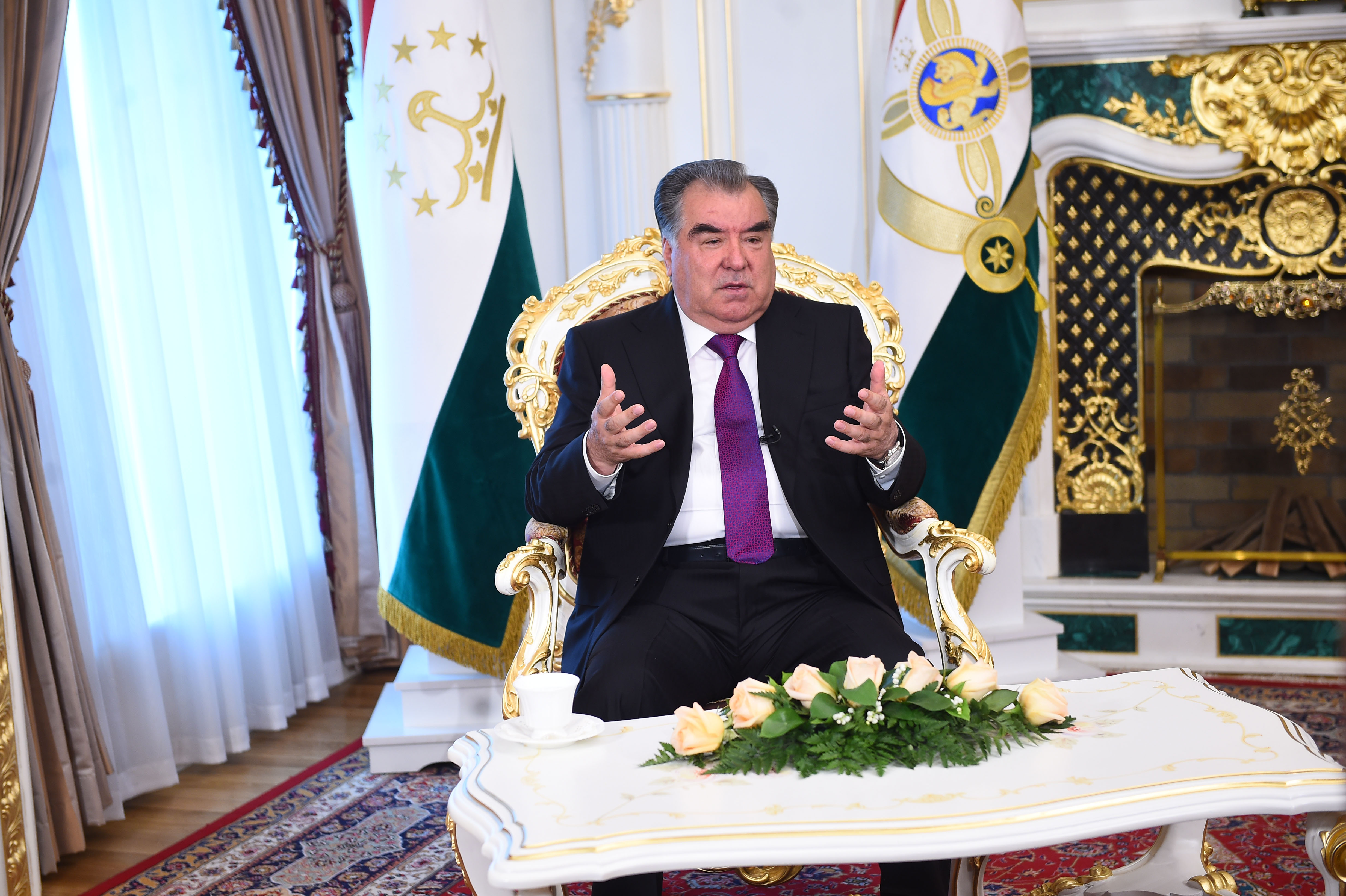 2019年4月13日,塔吉克斯坦总统拉赫蒙在杜尚别接受中国媒体联合采访。