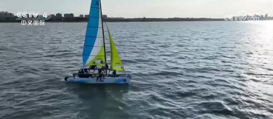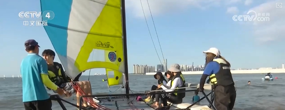 在海口市西秀海滩帆船帆板运动基地,一个来自英国的研学团正在这里学习帆船帆板。