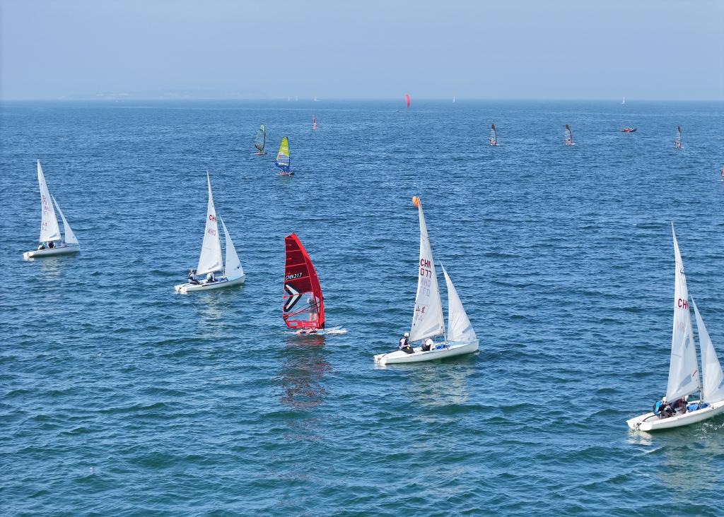 8月8日,水上运动爱好者在山东烟台四十里湾海域驾驶帆船和帆板(无人机照片)。 新华社发(唐克摄)