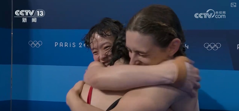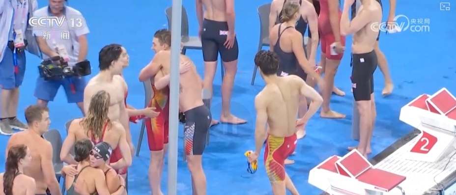 在男女混合4×100米混合泳接力比赛后,对手特别跑来,给刚刚从伤病中恢复的张雨霏献上拥抱。