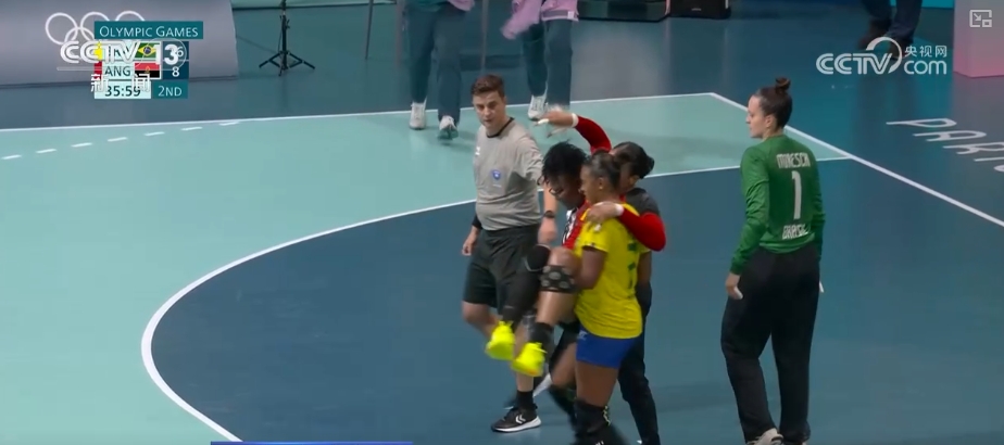 在手球赛场,安哥拉球员射门后倒地无法站起,作为其对手的巴西球员将她抱起送到场边。