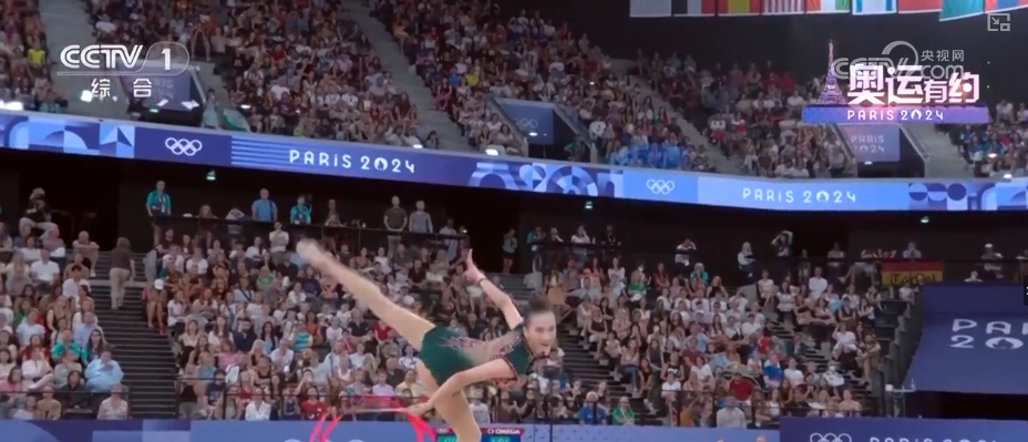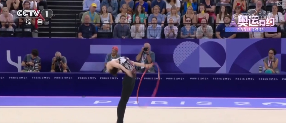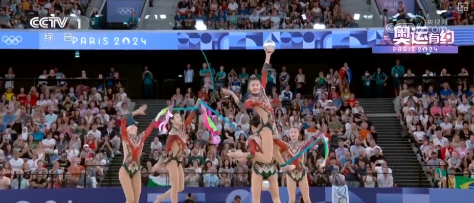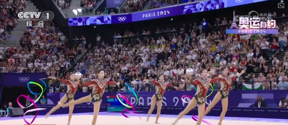 而在艺术体操女子团体全能决赛中,中国艺术体操的姑娘们以总分69.8分,拿下该项目的金牌。在决赛三带两球项目《凤鸣凌霄》表演中,伴随着动听的音乐,姑娘们灵活地运用彩带和球,以精准的动作、极具张力的表演,诠释了汉唐国风的民族美学。