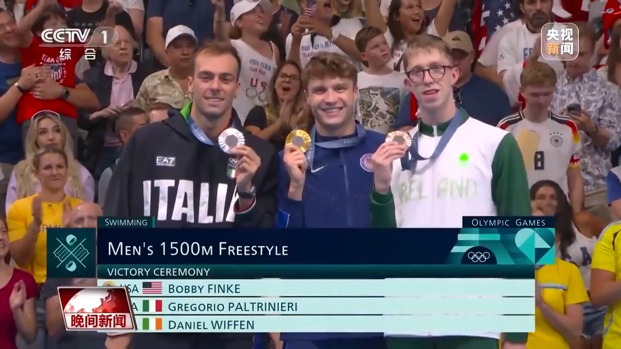 游泳项目,速度比拼。男子1500米自由泳决赛,身处第7道的美国选手芬克,从一入水就处于领先的位置,最终以14分30秒67触壁,获得冠军的同时,也打破了世界纪录。