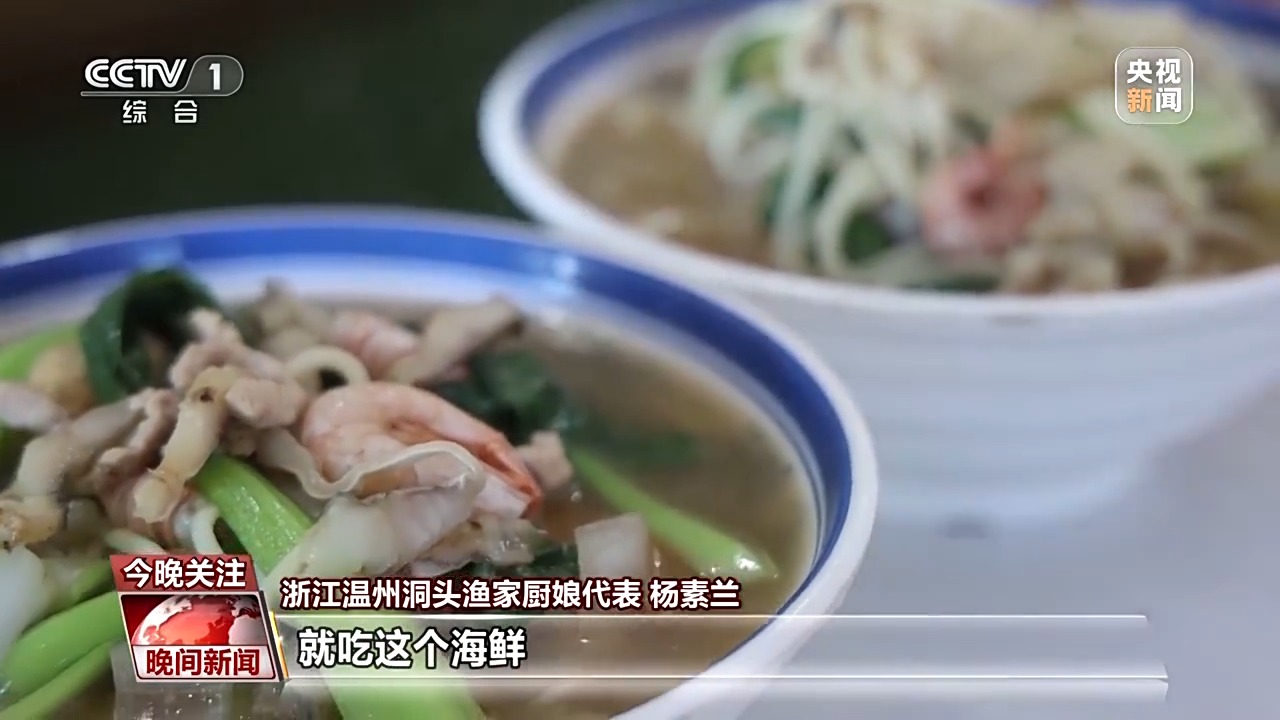 浙江温州洞头渔家厨娘代表 杨素兰:昨天有一个新鲜的鮸鱼、墨鱼,早上四点半就开始做,做了50斤,昨天的那个鮸鱼那么大。有个外地游客,我们烧一碗给他吃,他买了38斤。