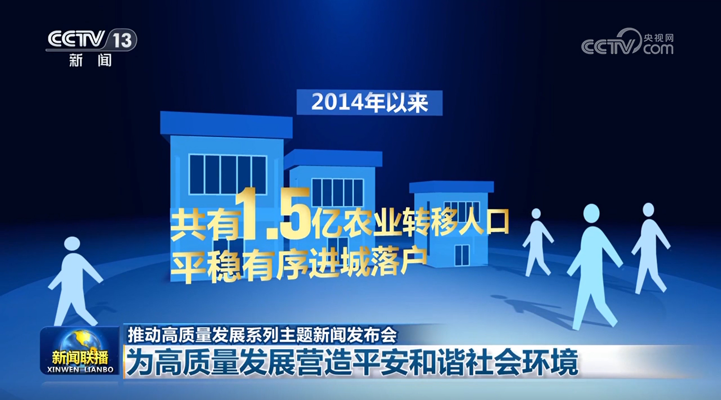 近年来,公安机关有序推进农业转移人口市民化。2014年以来,共有1.5亿农业转移人口平稳有序进城落户,全国户籍人口城镇化率由2014年的35.9%提高到2023年的48.3%。