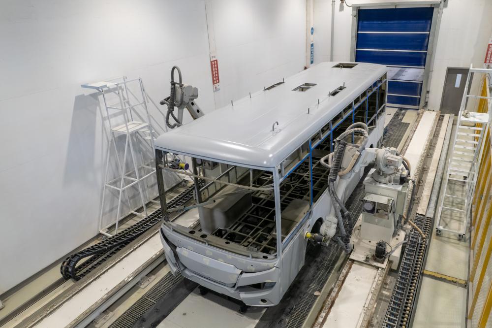 在湖南常德中车新能源汽车有限公司涂装车间,中涂漆打磨机器人在打磨喷涂(无人机照片,4月25日摄)。新华社记者陈思汗摄