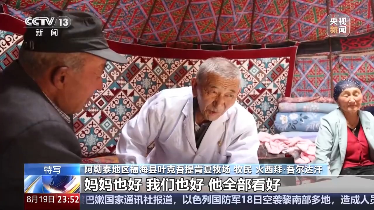 阿勒泰地区福海县叶克吾提肯夏牧场牧民 火西拜·吾尔达汗:1986年,我老妈病得厉害。妈妈也好,我们也好,他全部看好。我有高血压,还有坐骨神经痛。毛医生看了后,现在好得很。30年的朋友,一生的好朋友。