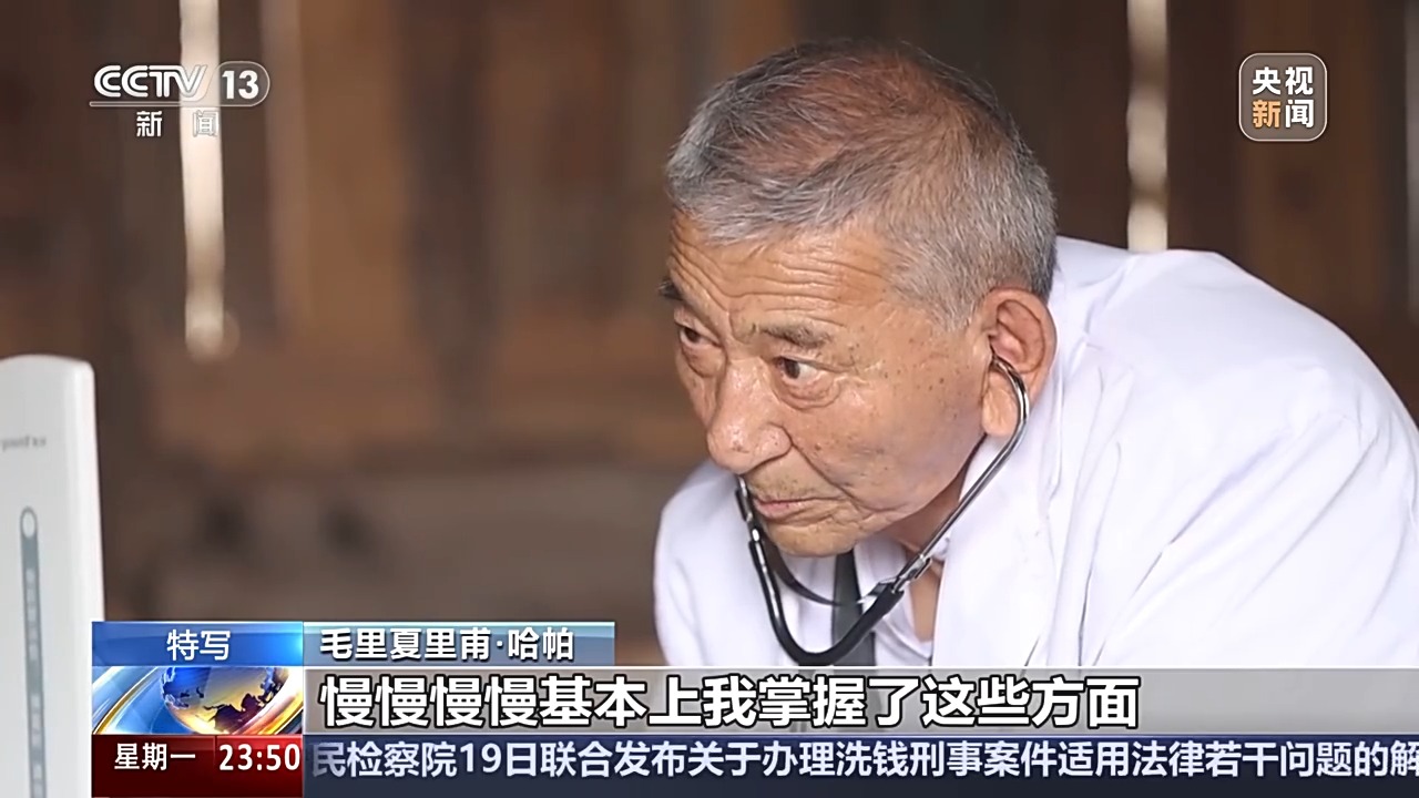 毛里夏里甫·哈帕:我八岁开始跟着父亲行医,我想爸爸治好那么多病人,他们生活越来越好,我也当这样的医生不行吗。号脉、拿药、拔火罐,基本上我掌握了这些方面。那时候牧民苦得很,爸爸跟我说,不管患者有没有钱,要先把病看好。