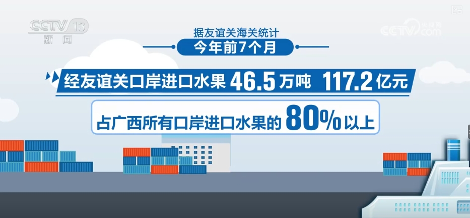 据友谊关海关统计,2024年前7个月,经友谊关口岸进口水果46.5万吨、117.2亿元,占广西所有口岸进口水果的80%以上。