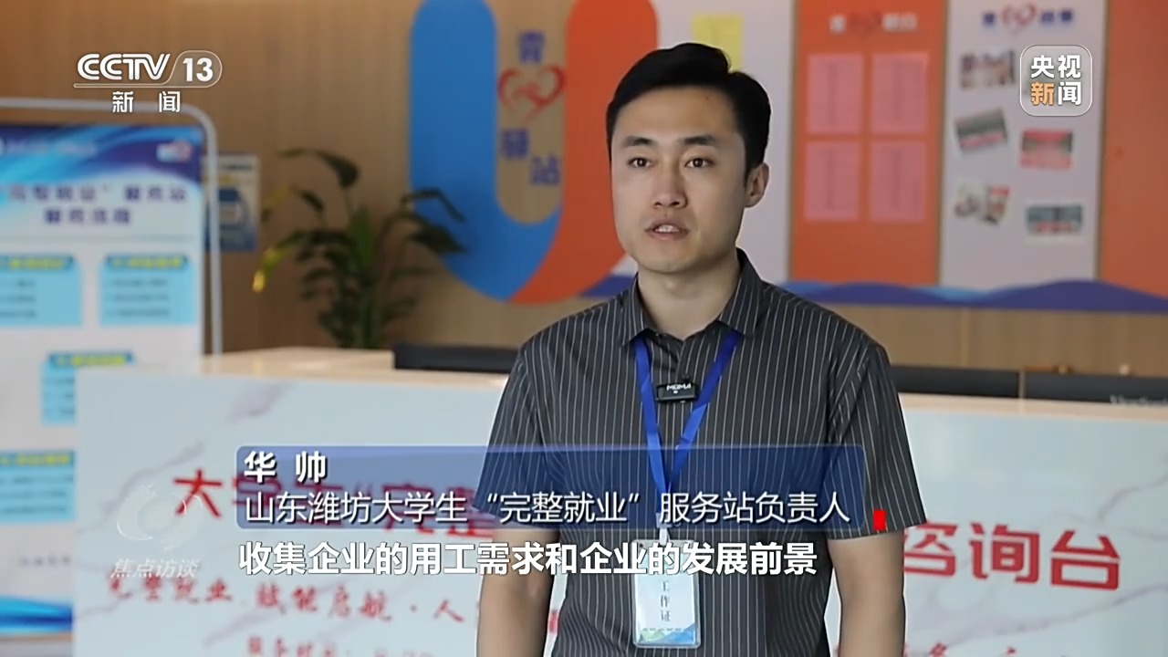 山东潍坊大学生“完整就业”服务站负责人 华帅:第一个渠道是服务站的工作人员,主动到潍坊市各个企业走访和调研,收集企业的用工需求和企业的发展前景,来针对性地匹配相应的就业人员;第二种渠道是每个行业或者企业慕名而来,到服务站主动报送用工需求,目前服务站一共与两百多家企业进行了合作。
