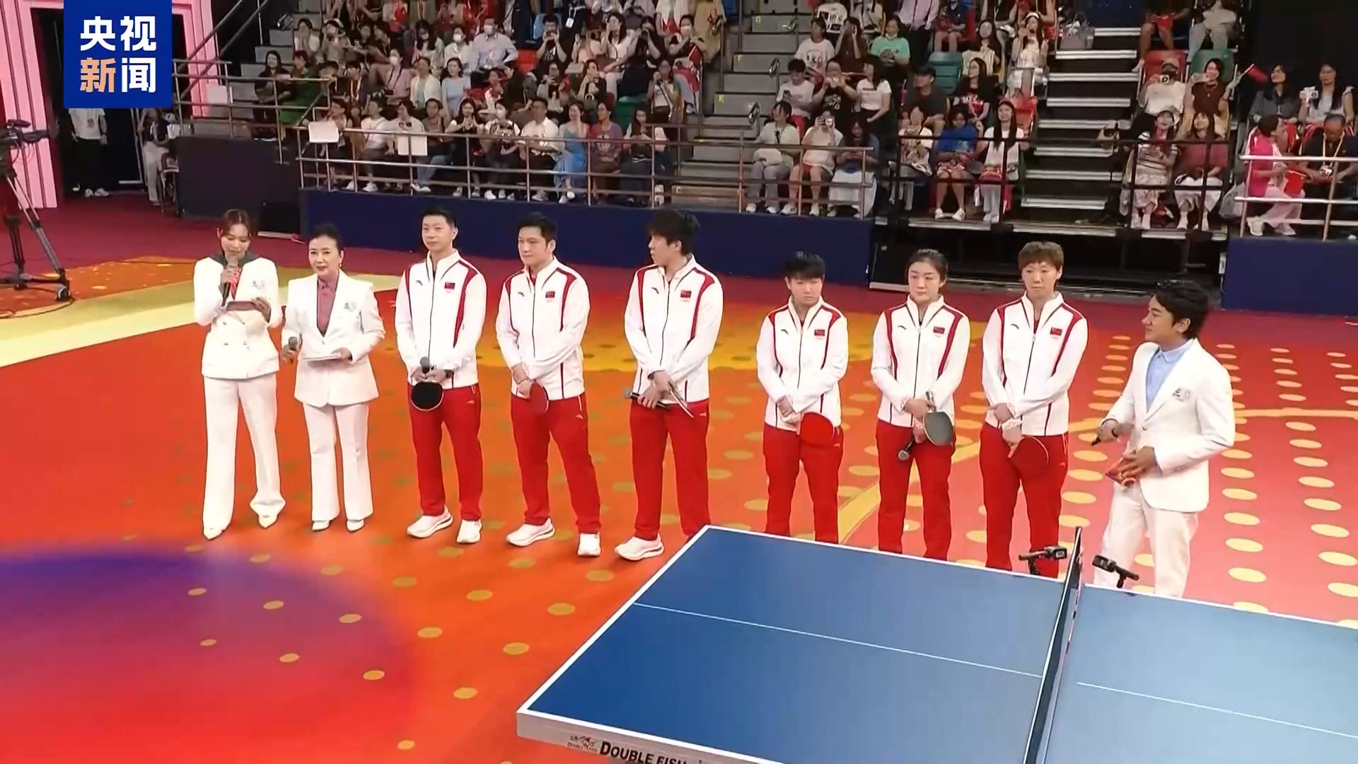 汇演中,最先登场的是中国国家乒乓球队的六名队员,他们在现场进行了一场别开生面的3对3男女乒乓球比拼展示。