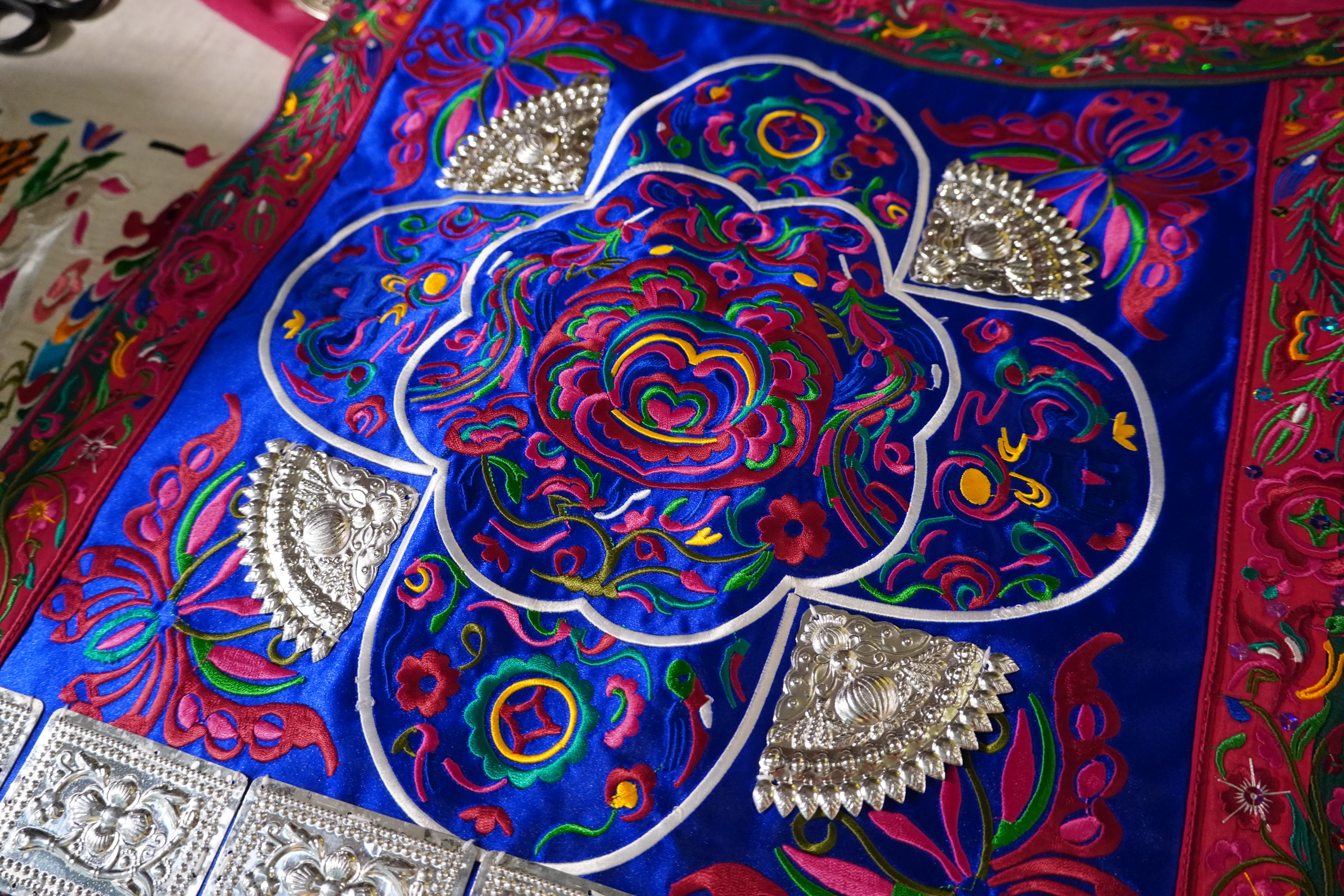 侗绣承载着侗族人的信仰与记忆,大自然是绣娘的灵感来源,花鸟虫鱼、太阳月亮在她们手中,转化为令人叹为观止的图案。年轻绣娘的手艺多半来自母亲传承,覃桂珍的母亲韦清花正是一位侗族刺绣代表性传承人,曾代表国家出国交流。一个月前,覃桂珍以母亲名字命名的第二家“清花绣坊”开业。“第一家店开在县城,第二家选在程阳八寨。”
