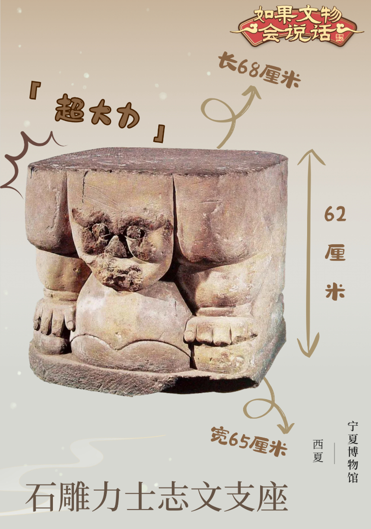1974年出土于银川西夏陵6号陵东碑亭遗址,这件文物由白沙石雕凿而成,近似正方体。呈现出一个男性大力士的形象,他跪坐在地上,双手压膝,表情严肃。座顶左上角阴刻西夏文3行共15个字,详细描述了其制作和雕刻的过程。支座背部阴刻汉文1行6字,为“砌垒匠高世昌”,应是众多修建陵墓者留下的唯一一个工匠的名字。在西夏陵区先后出土了十几座这样的支座,但刻有文字者唯此一件,因此弥足珍贵,为国宝级文物。