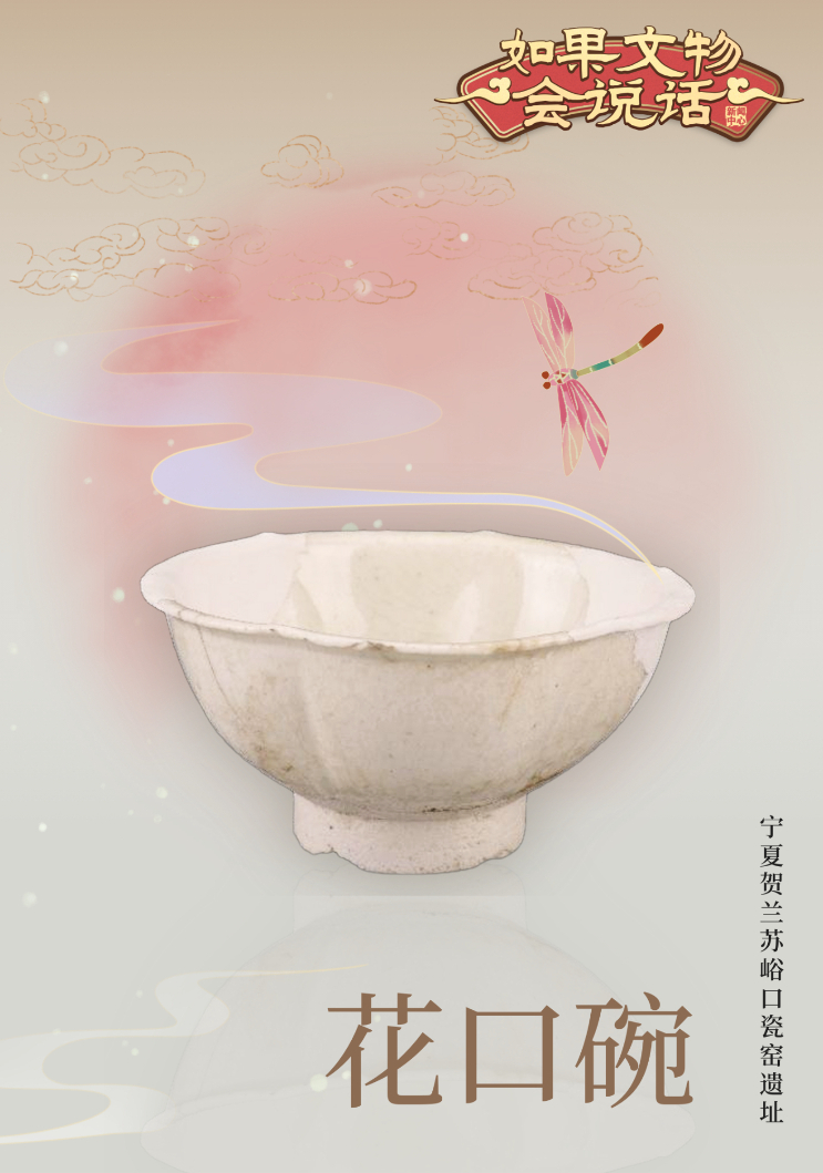 花口碗于2022年出土于宁夏贺兰苏峪口瓷窑遗址,此器物白中微泛青,玻璃质感强,制作工艺采撷两宋南、北各窑之菁华。
