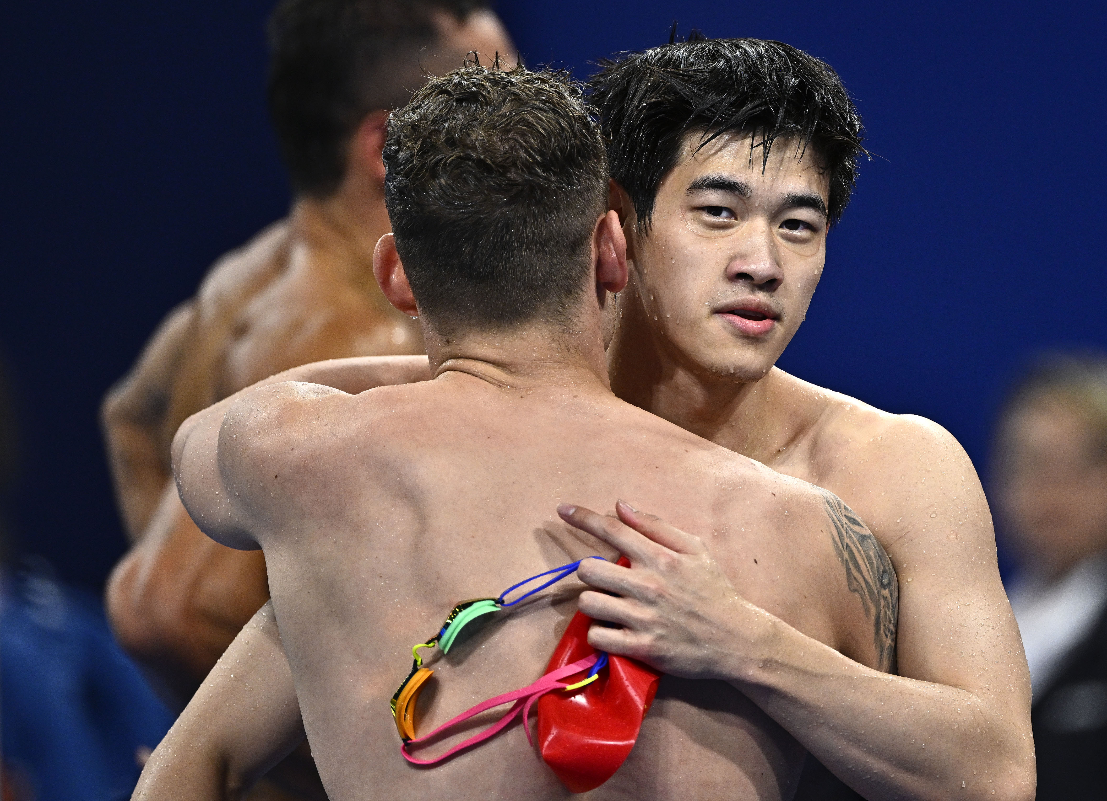 ↑中国队选手潘展乐(右)在比赛后接受祝贺。新华社记者 王鹏 摄