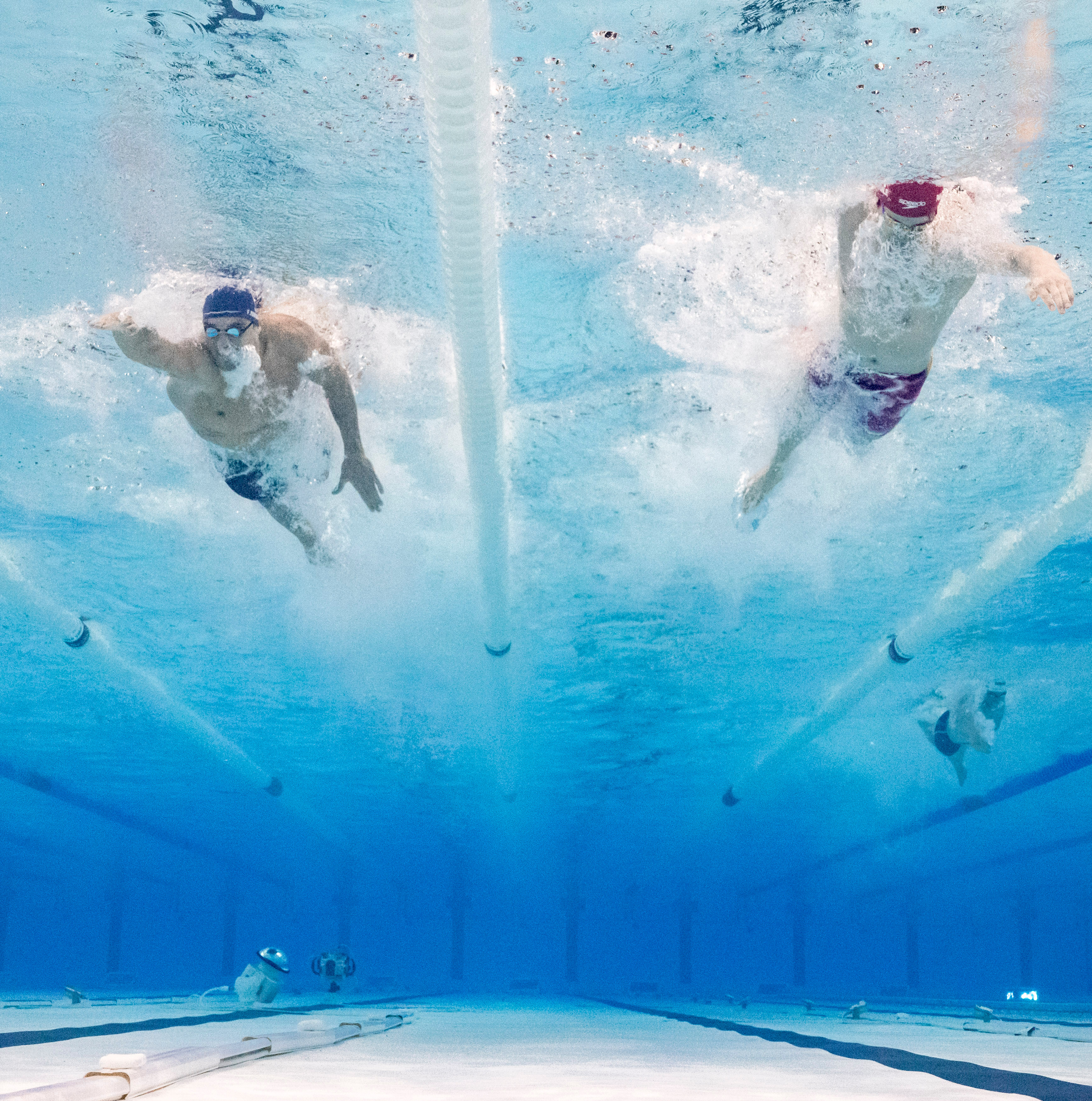 ↑中国队选手潘展乐(右)在最后阶段冲刺。新华社记者 夏一方 摄