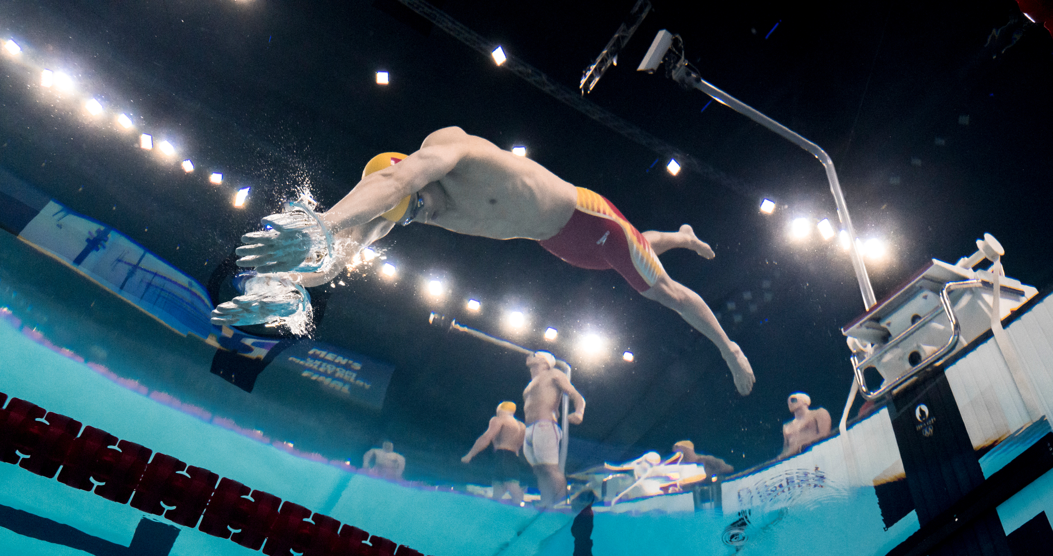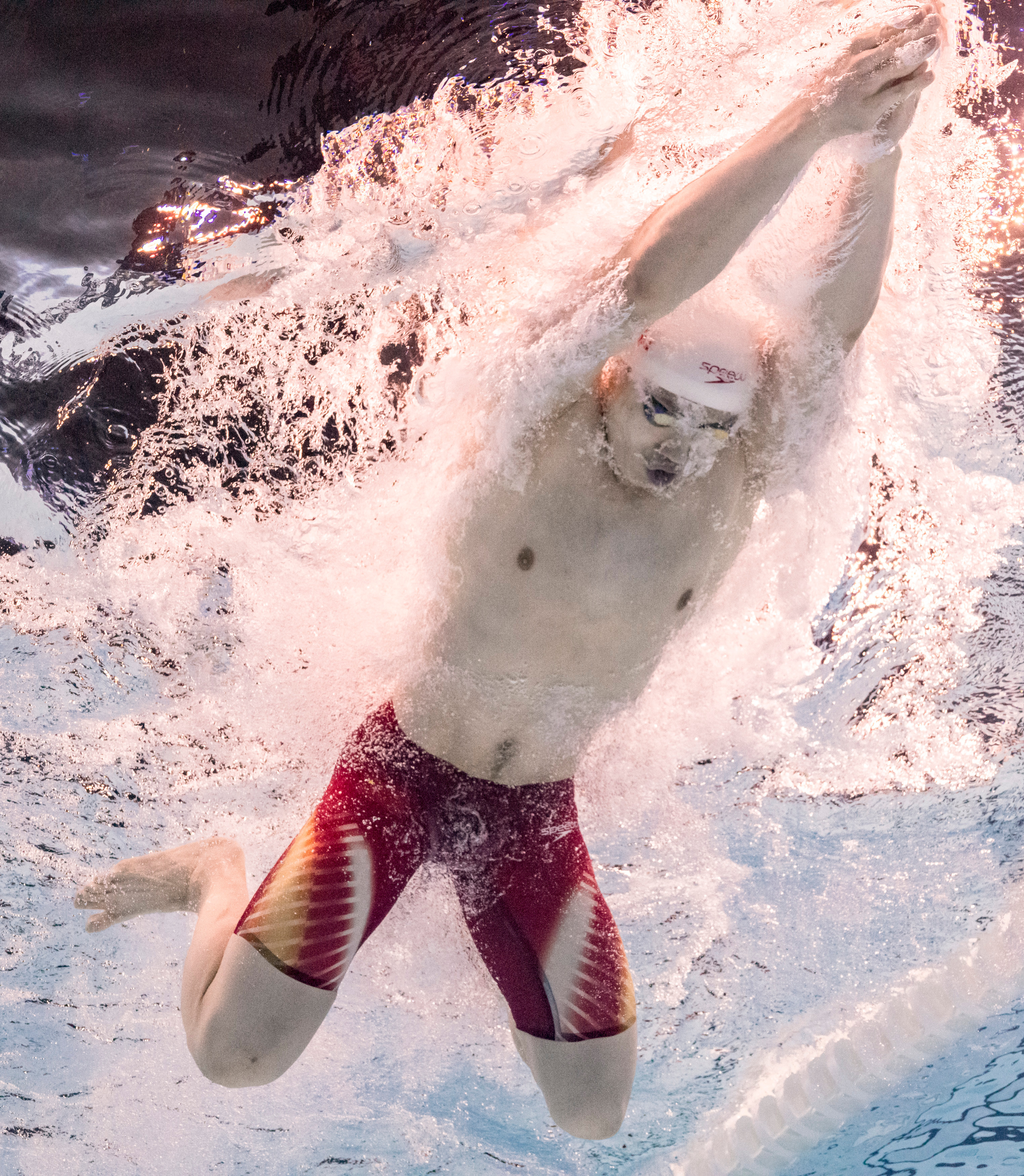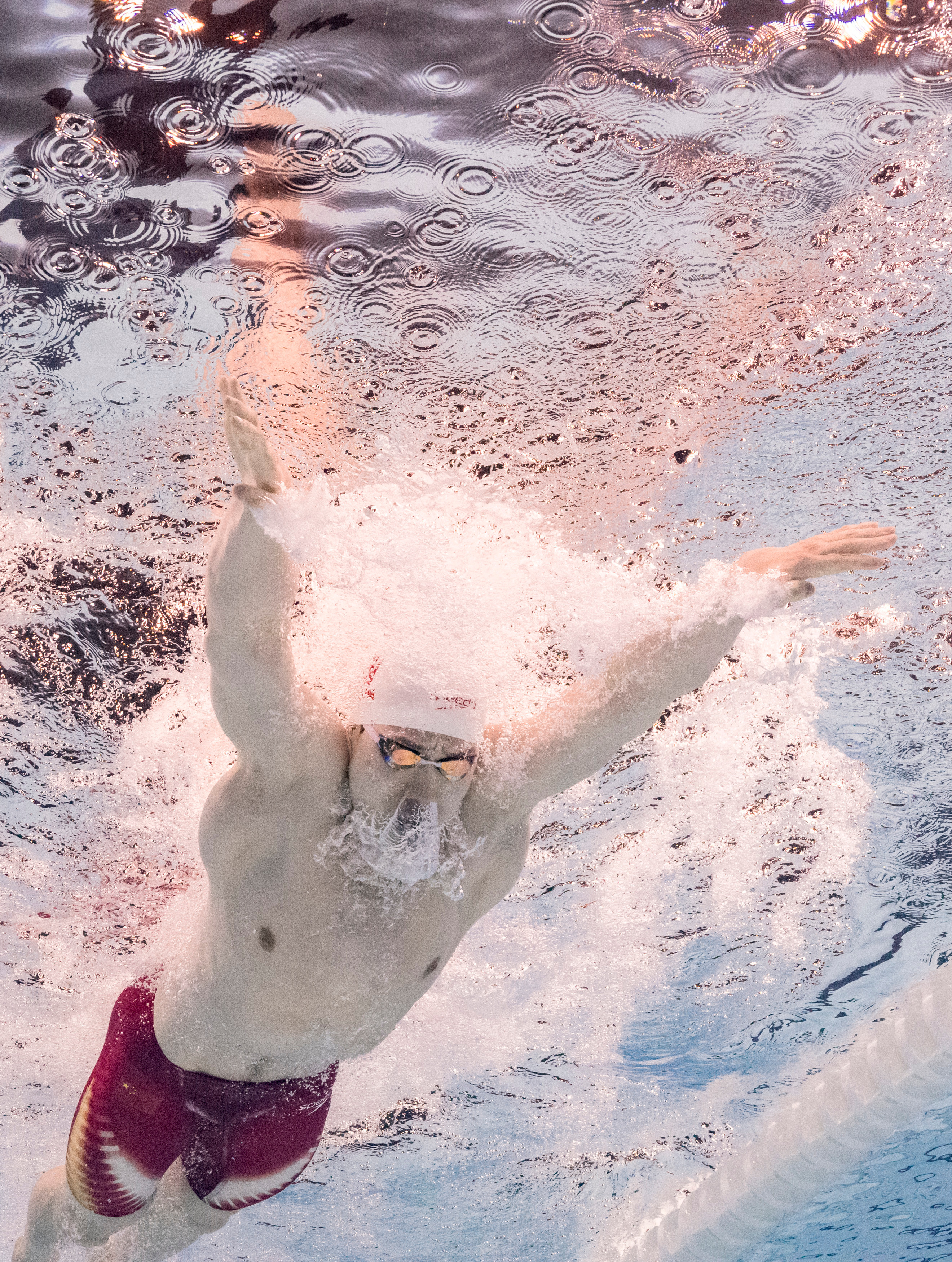 ↑中国队第一棒选手徐嘉余比赛中入水。新华社记者 夏一方 摄