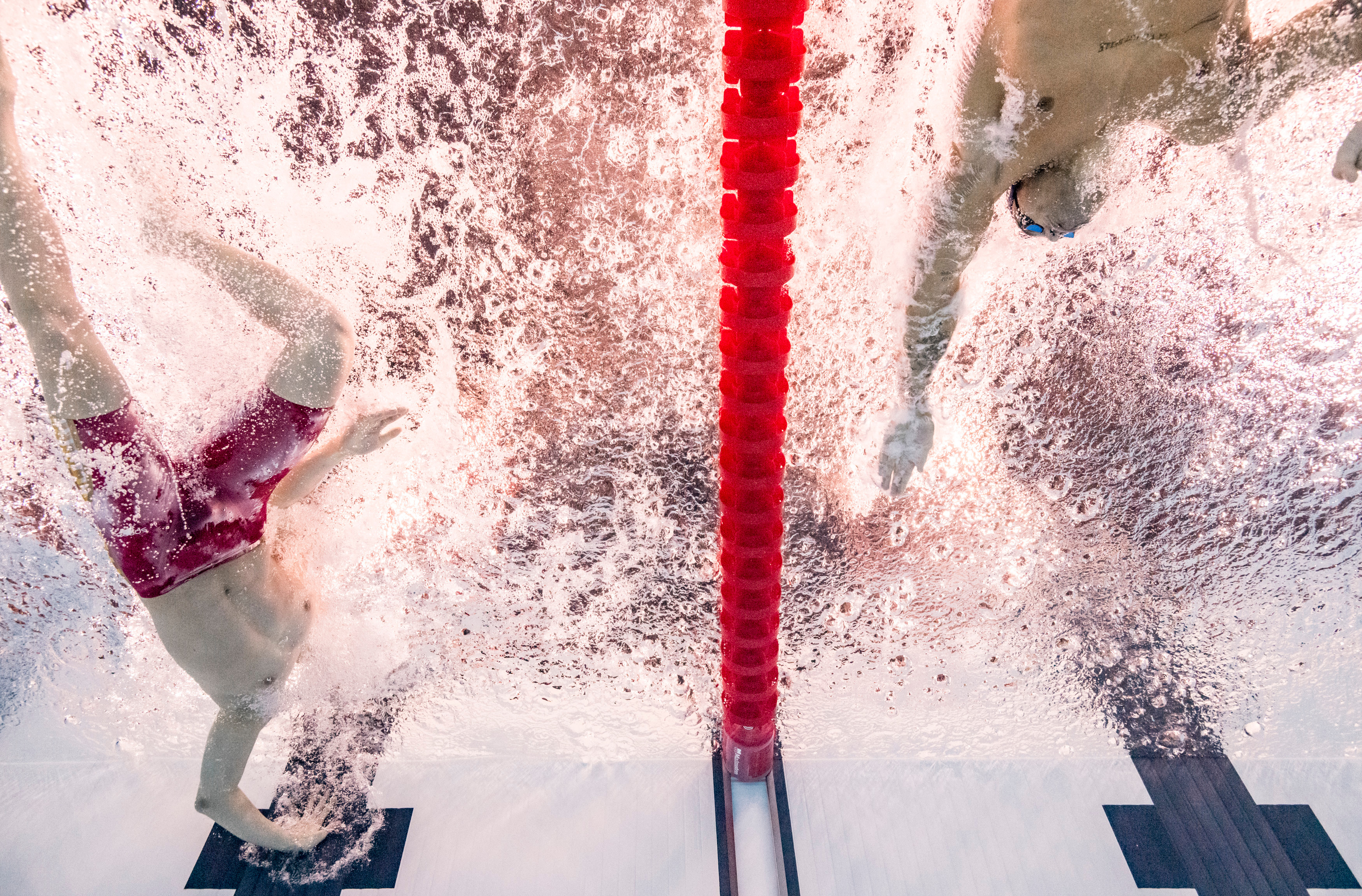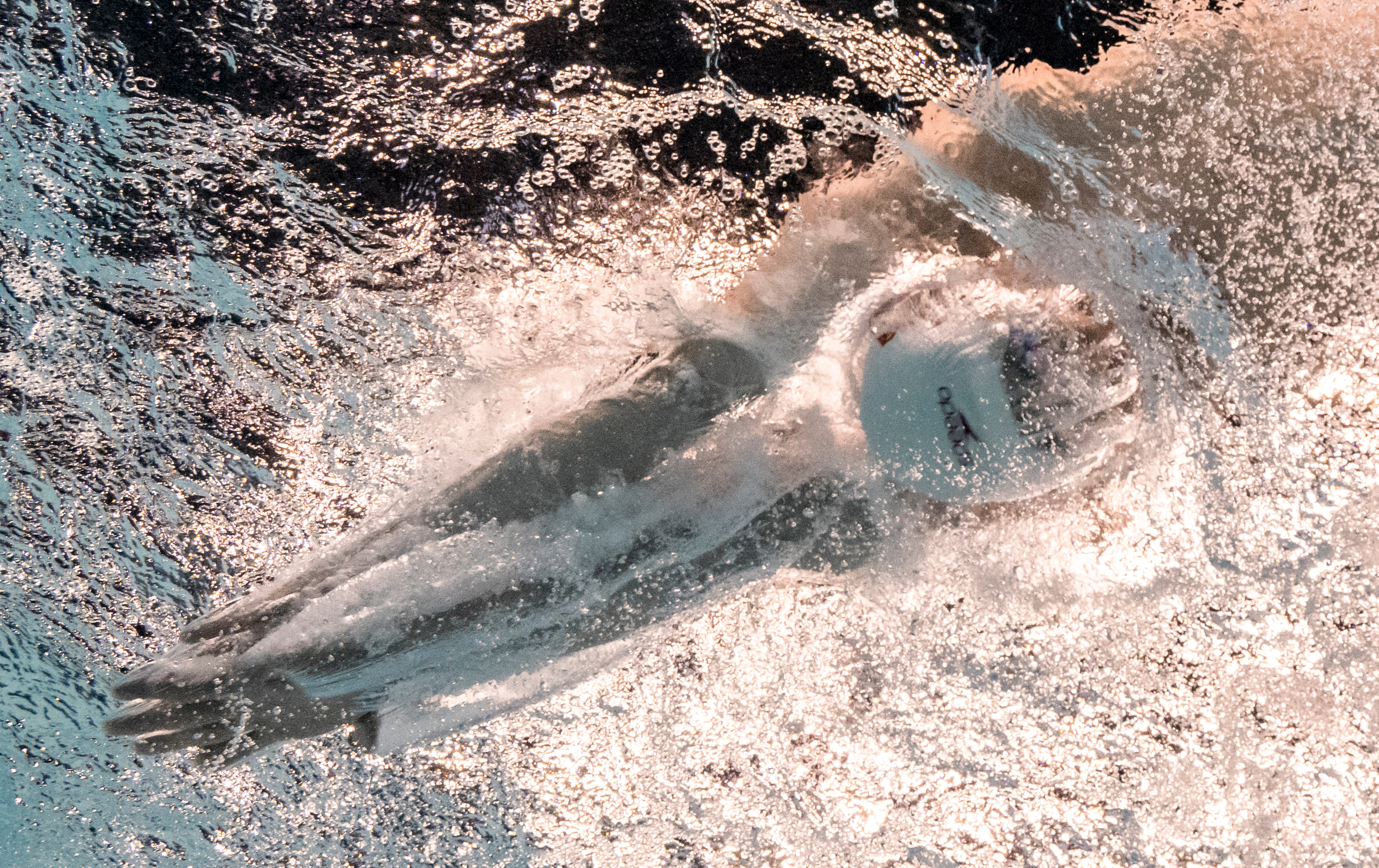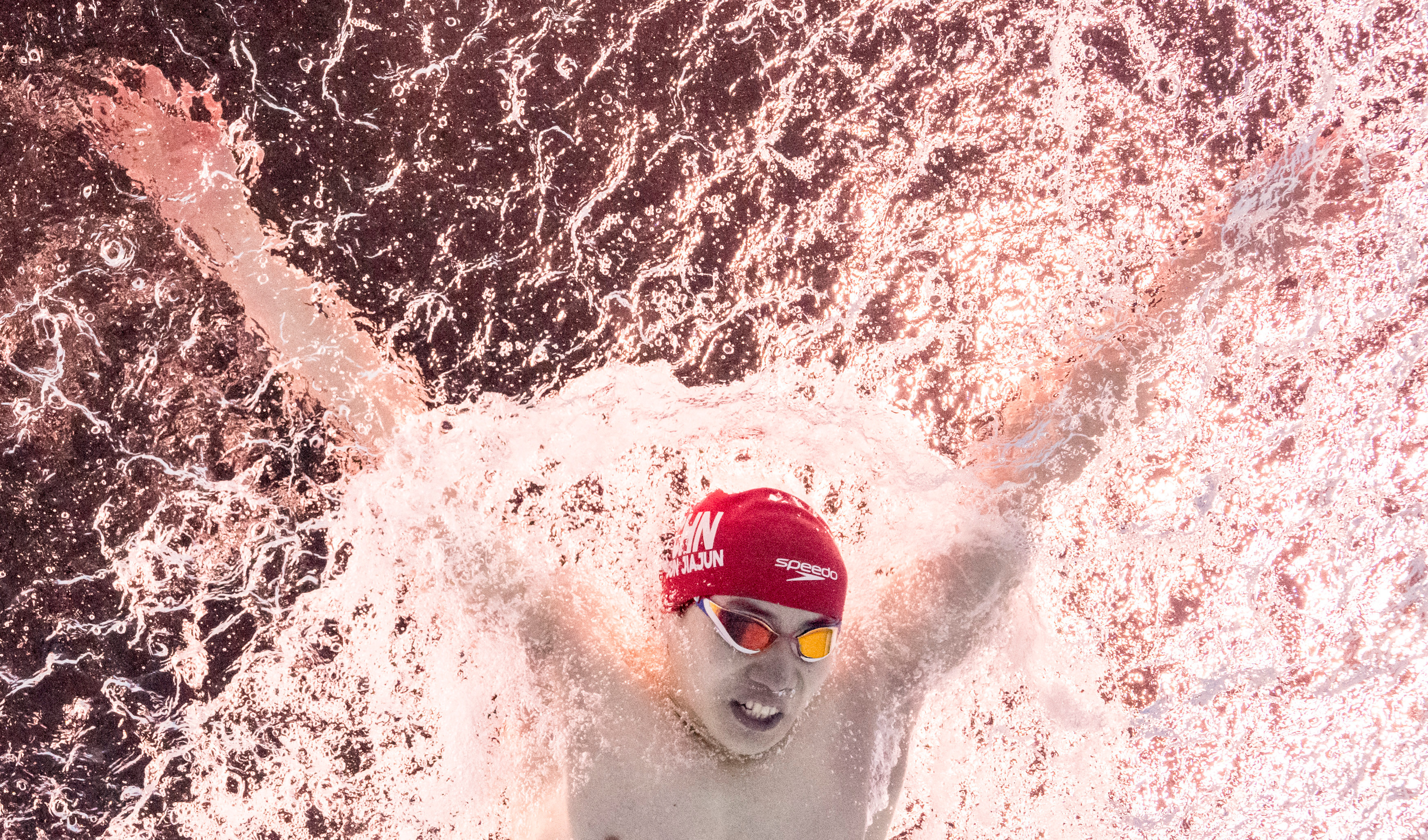 ↑中国队第一棒选手徐嘉余比赛中入水。新华社记者 夏一方 摄